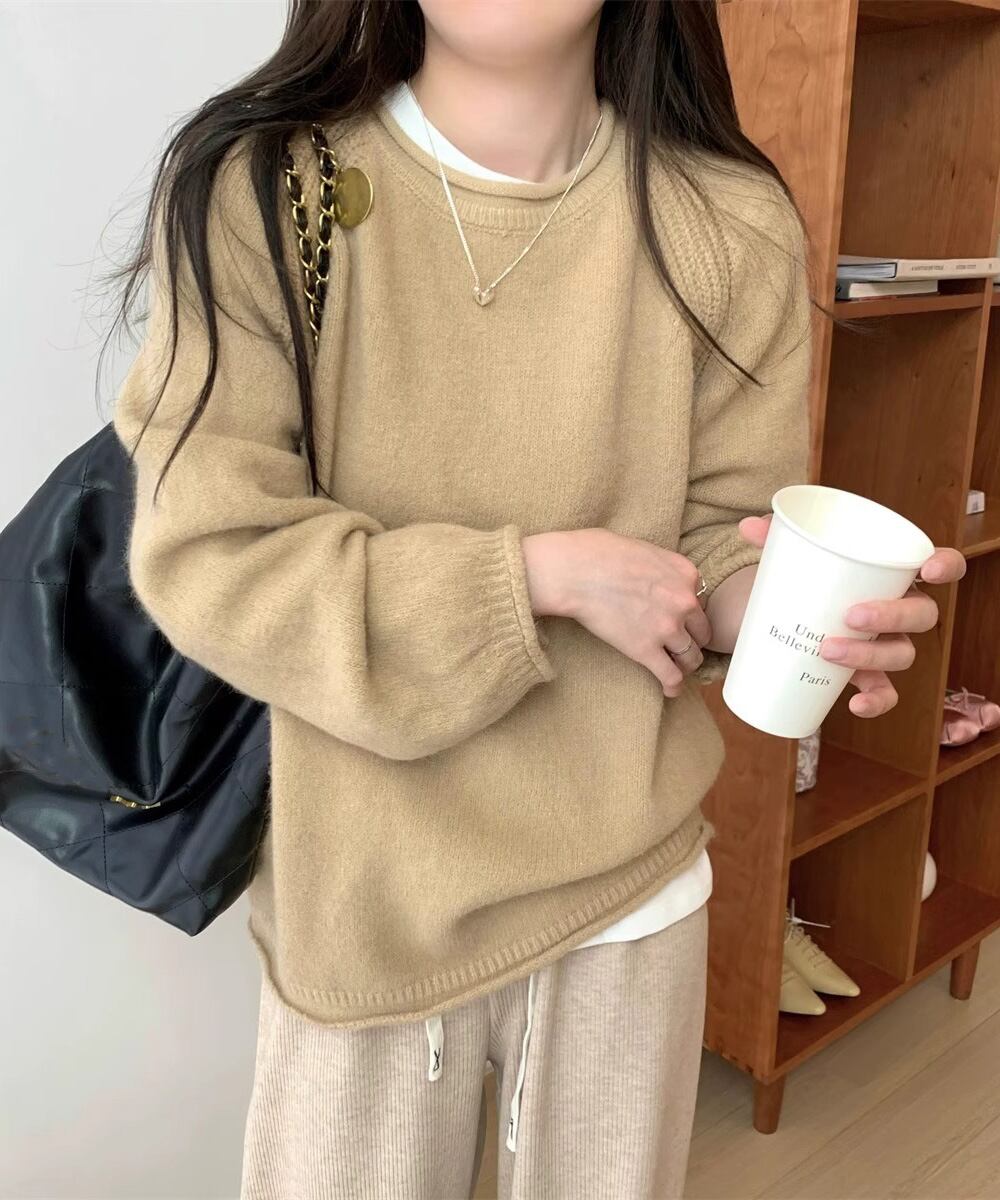 シンプルながら、ラグランスリーブの編み地ディテールがさりげないアクセントに。