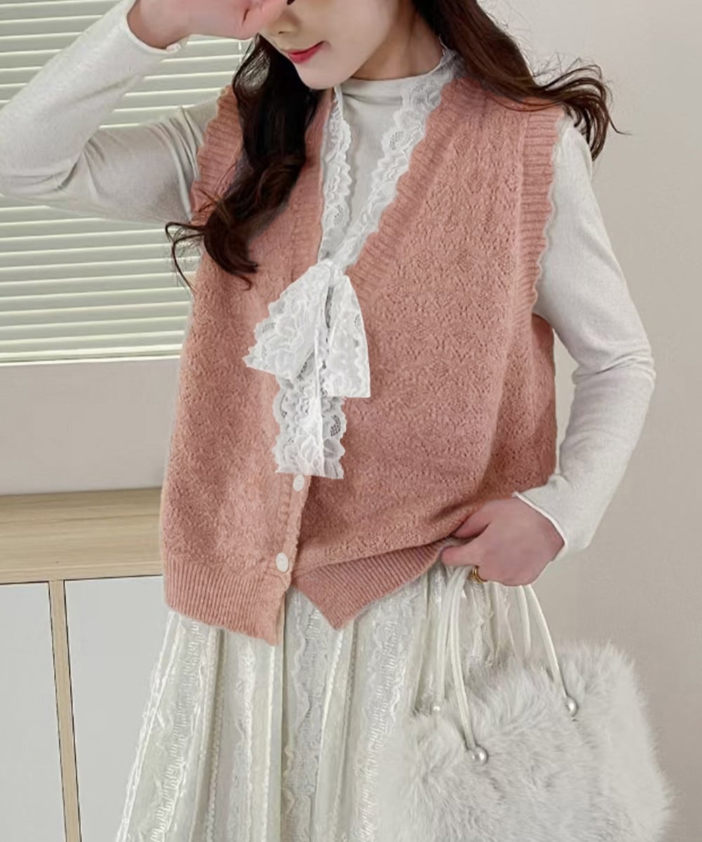 ネックラインにレースをあしらい、リボンがポイントになったニットベスト。