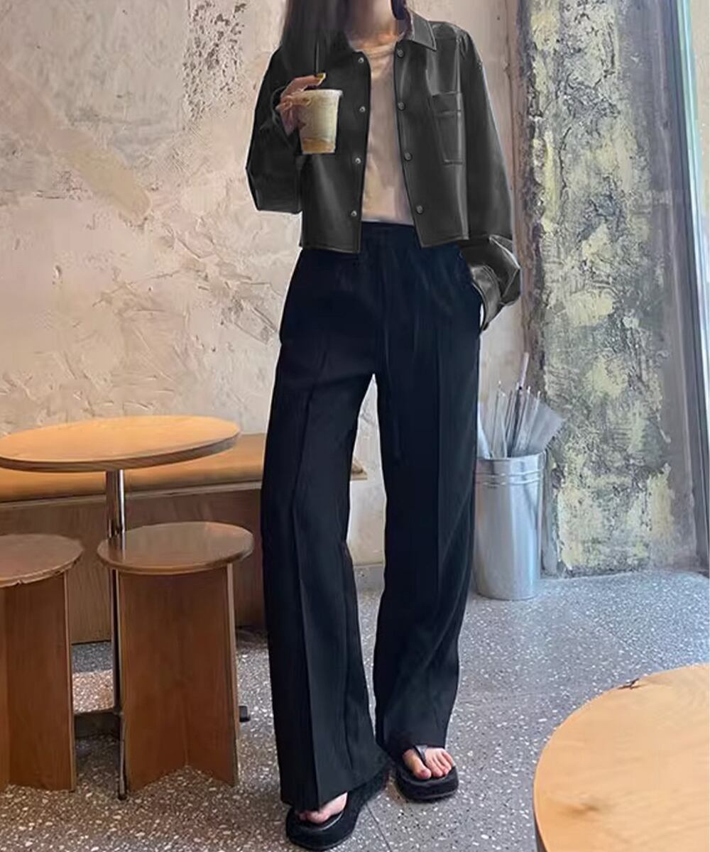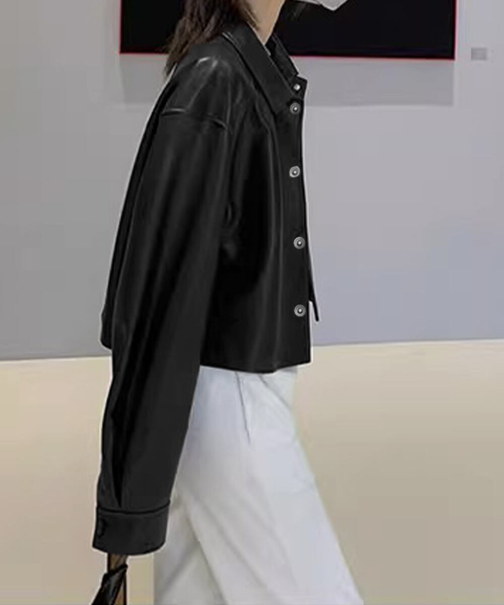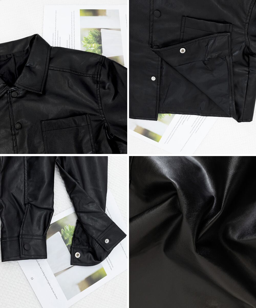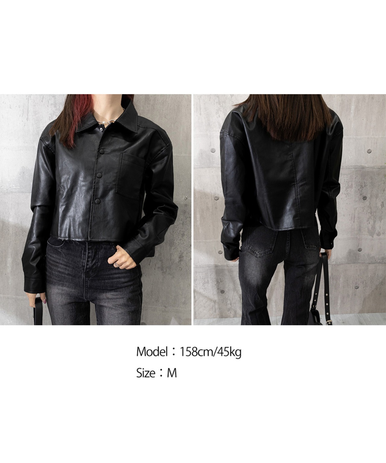 すっきりしたシルエットでシャープな印象の、ショート丈フェイクレザージャケットが新登場。