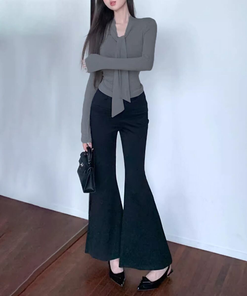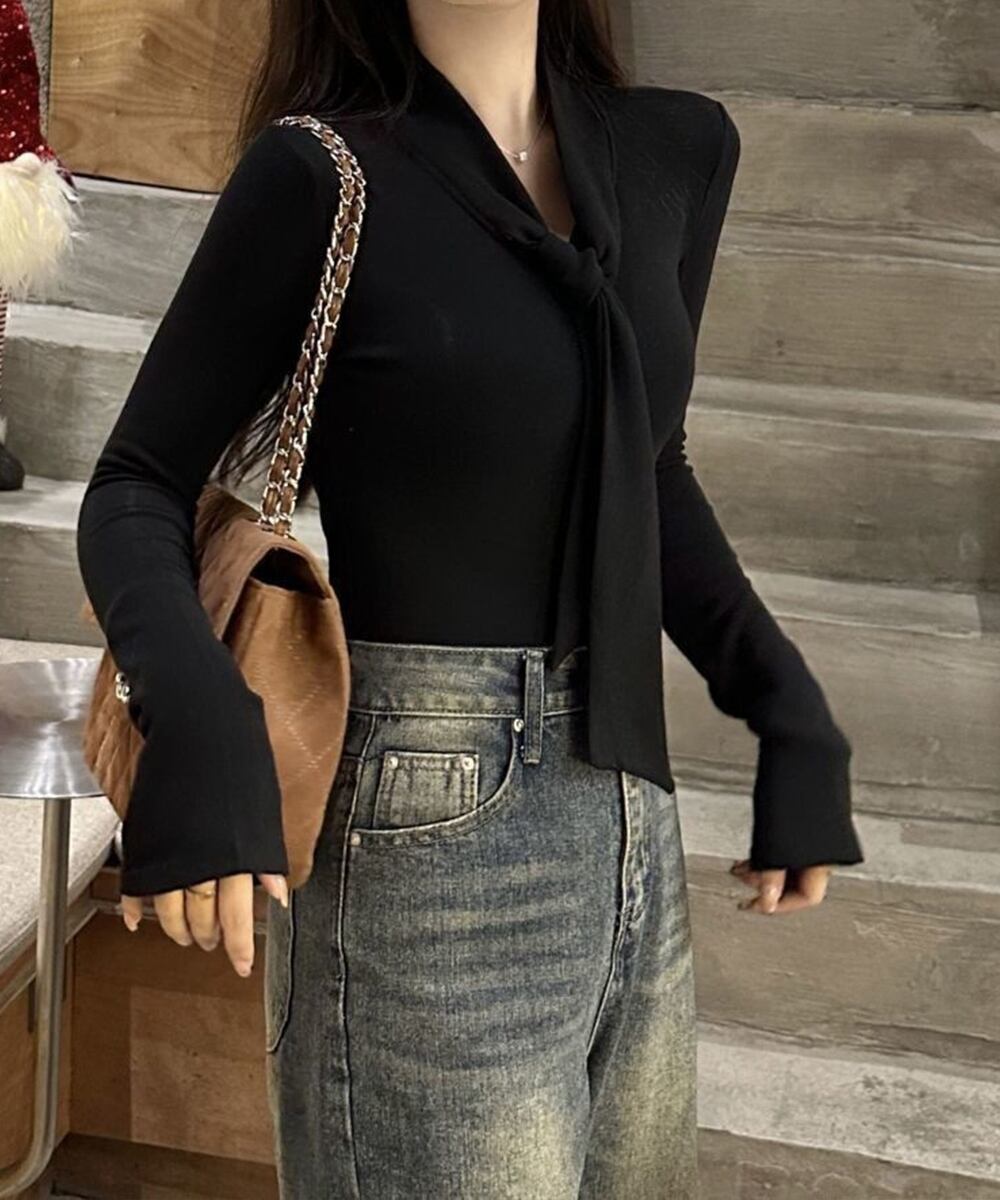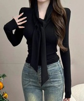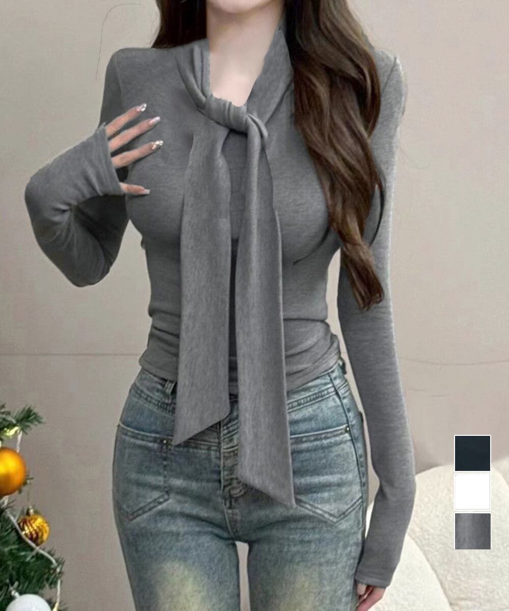 レディース 大人可愛い ボウタイカットソー スリムフィットタイトtシャツ 長袖無地カットソー 細見え 韓国風インナー秋冬