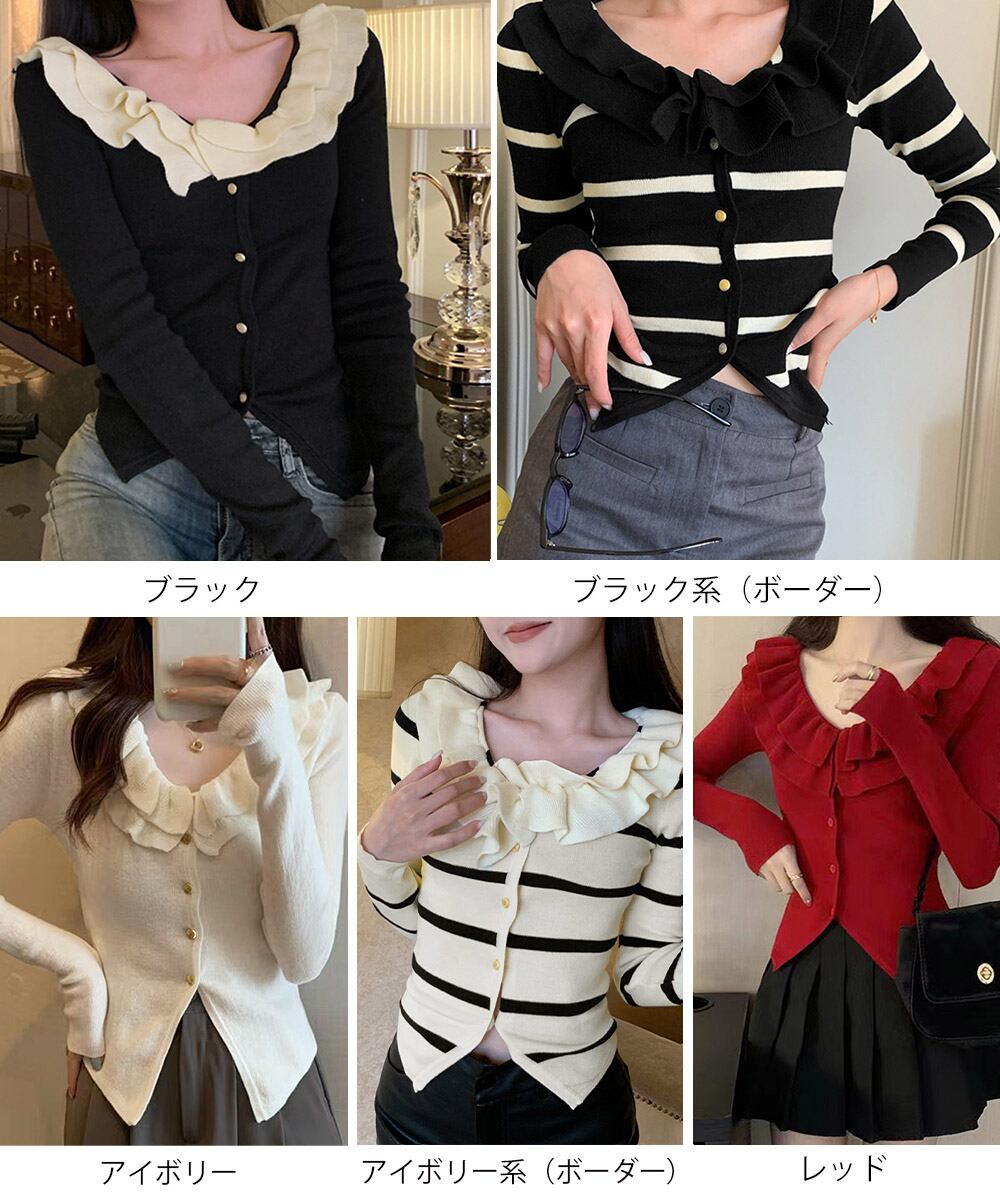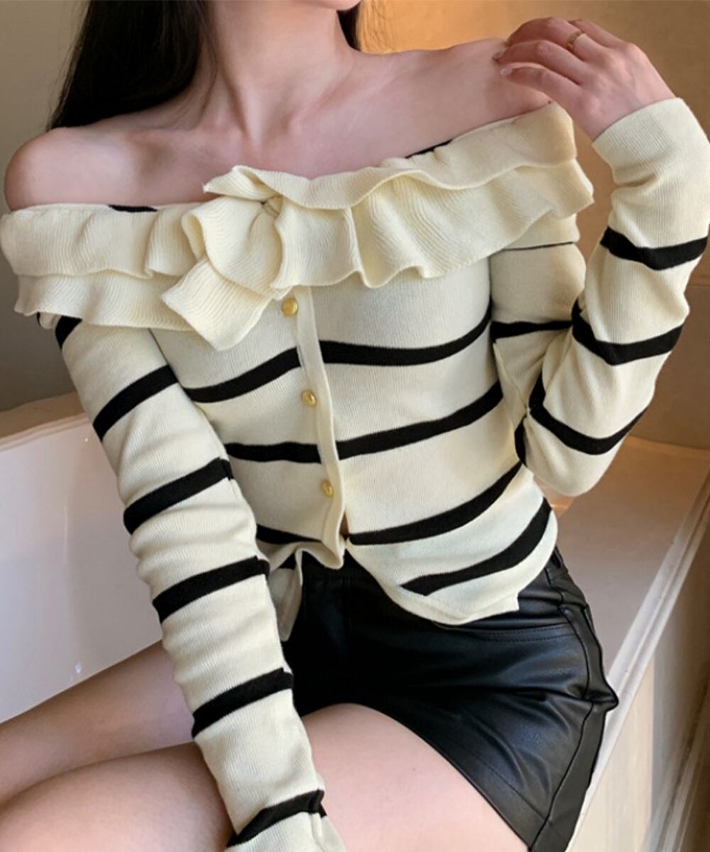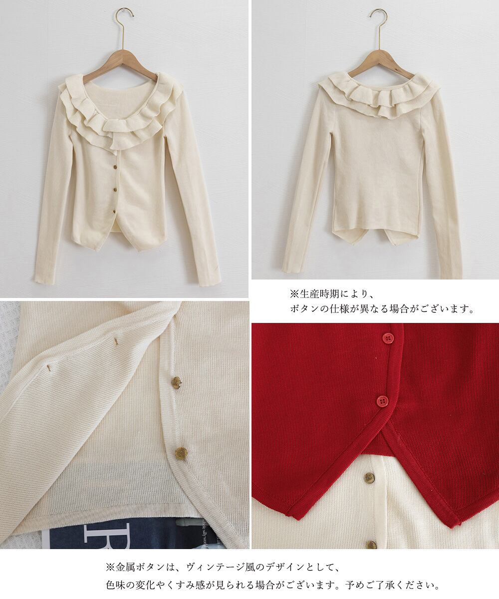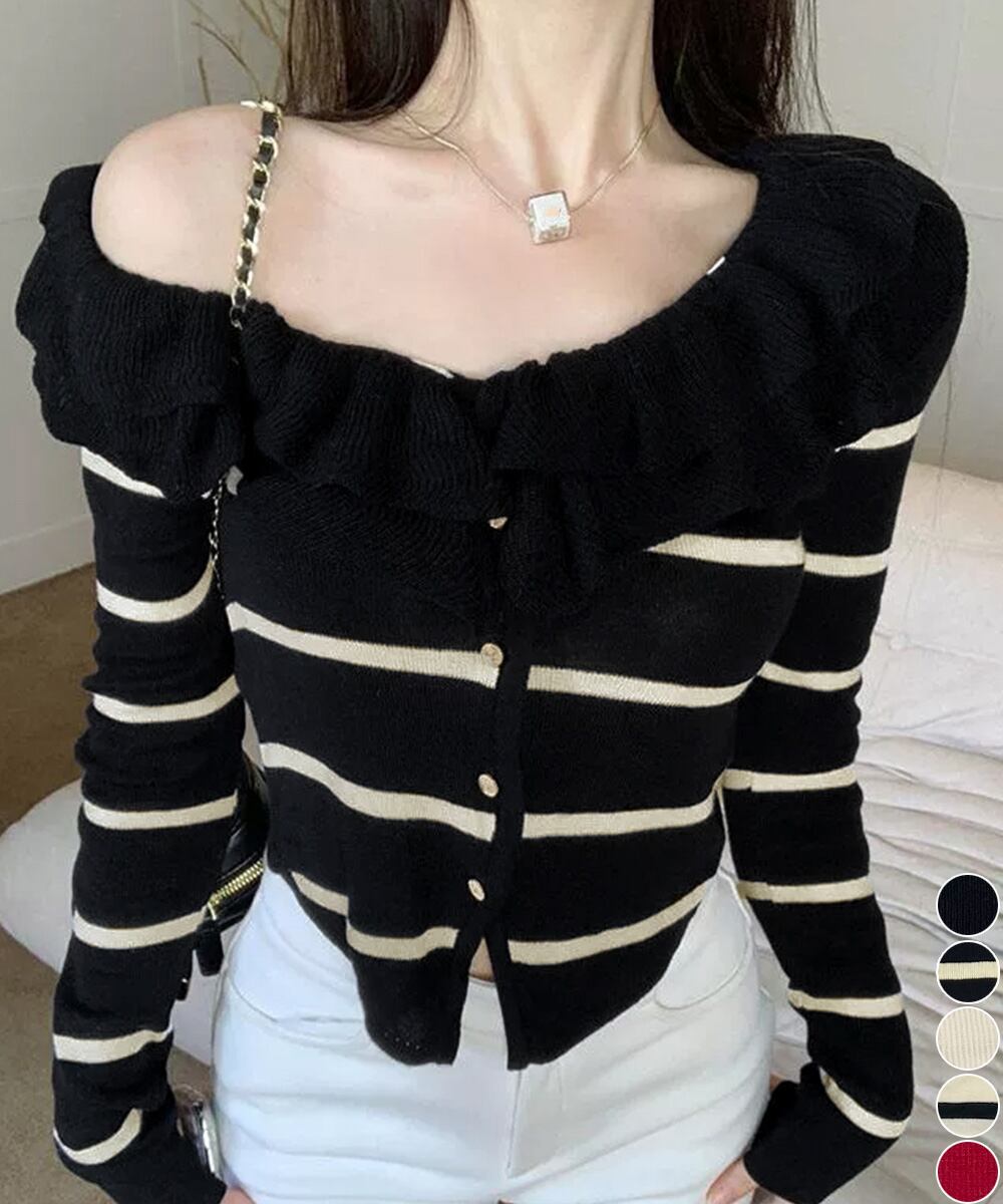 オフショルダー×フリルデザインが魅力のニットカーディガン。