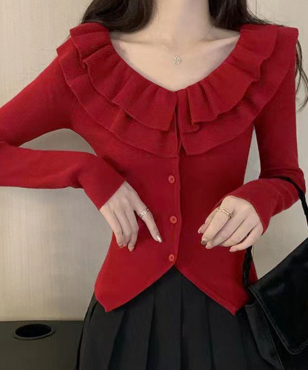 おしゃれ長袖春秋服 フリルネックニット 着回しニット韓国風