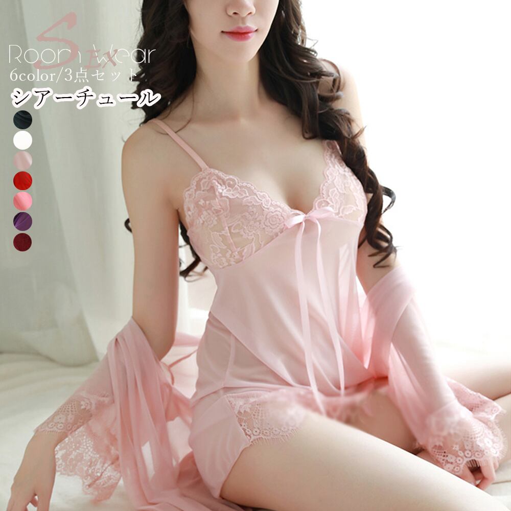 セクシーなシアーチュールで仕上げたキャミワンピース、ガウンとTバックの3点セットです
