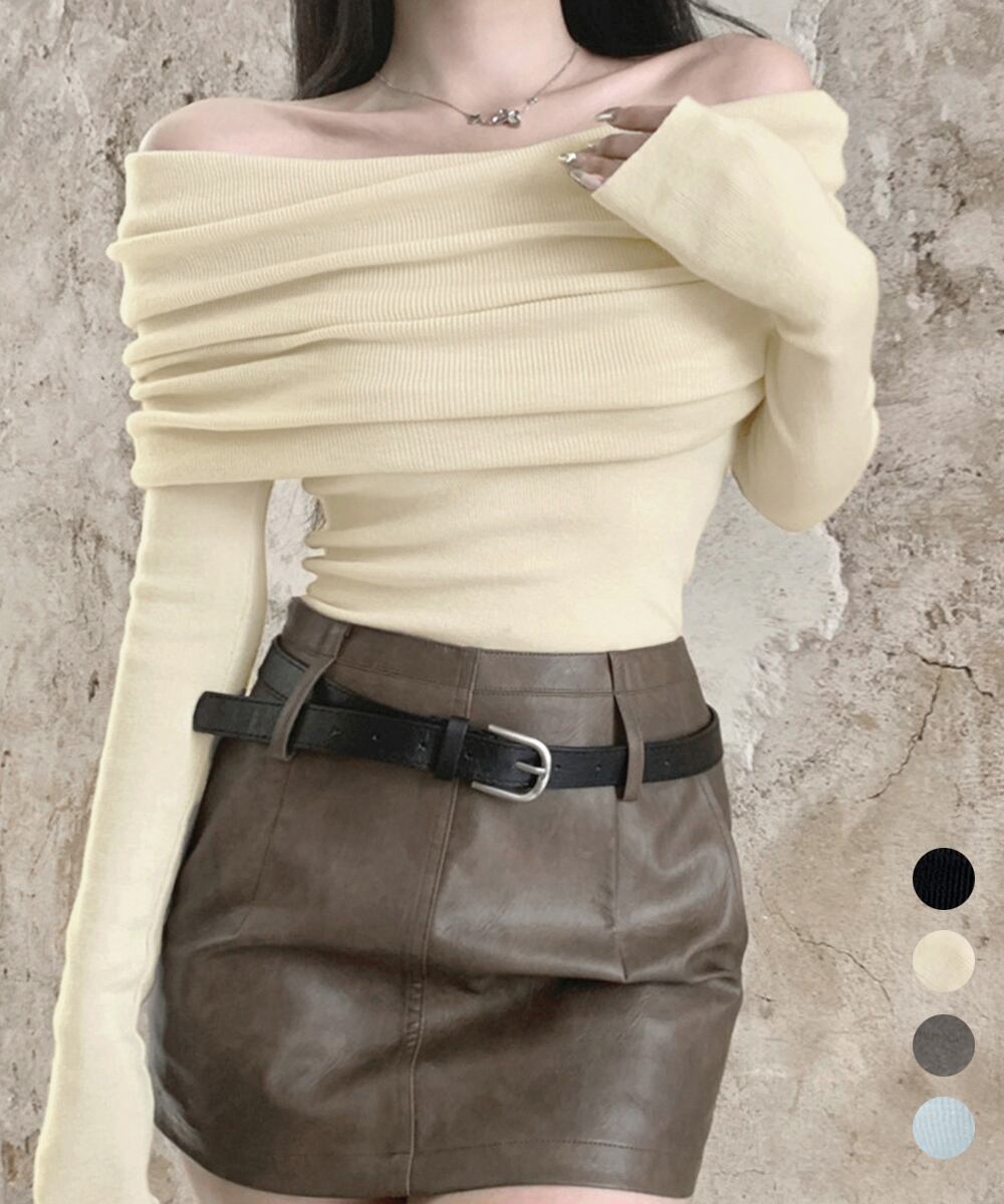 トレンドの折り返しデザインを取り入れたオフショルダーで、ヘルシーに肌見せできるニットトップス。
