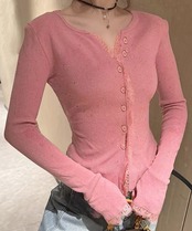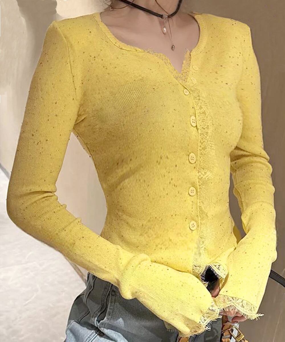 レーストリム付きのVネック長袖ニットカーディガン。