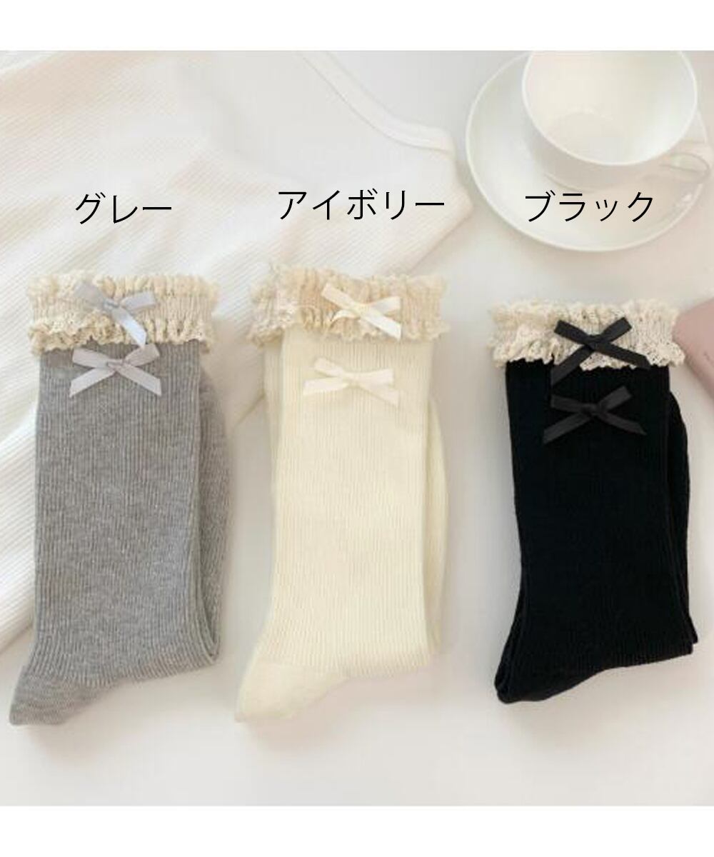 可愛い リブソックス リボン ガーリー靴下 カジュアル ロングソックス 春夏秋冬 おしゃれ フリルソックス 10代20代