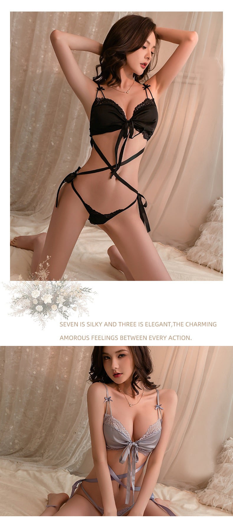 このノンワイヤーブラジャーとショーツのセットは、柔らかいサテンとレース素材を使用しており、洗練された魅力を演出します。フロント結びタイプとバックホックデザインにより、サイズ調整が可能で、多くの方にフィットする設計となっています。レース部分透け感のある、超軽薄な素材を採用しているため、着心地が軽やかで、長時間の着用でも快適です。