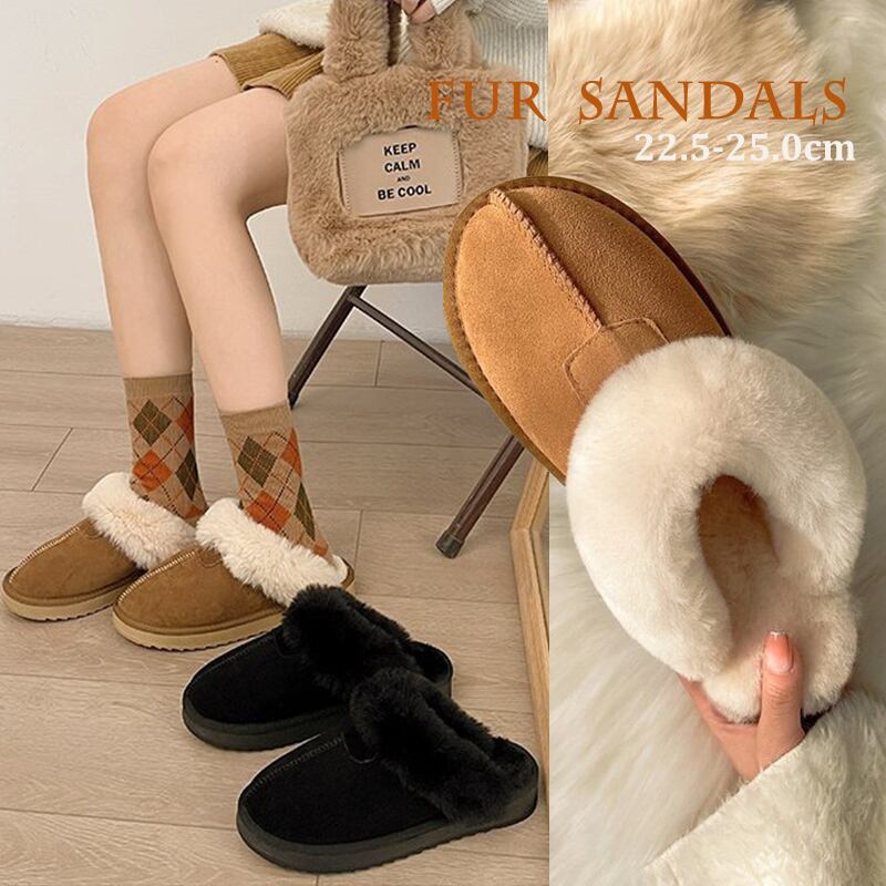 【海外からの取り寄せ】2023新作 レディース 靴 ファーサンダル スリッパ フェイクファー 秋冬 フラット 黒 裏起毛 黒 #[sandal486_15800]【送料込み】【250915】