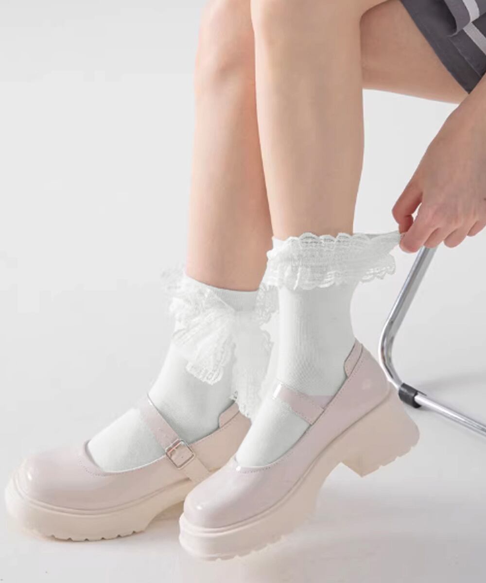可愛い フリルソックス ガーリー靴下 カジュアル ミドルソックス 春夏秋冬 おしゃれ ソックス 白黒 10代20代 学生