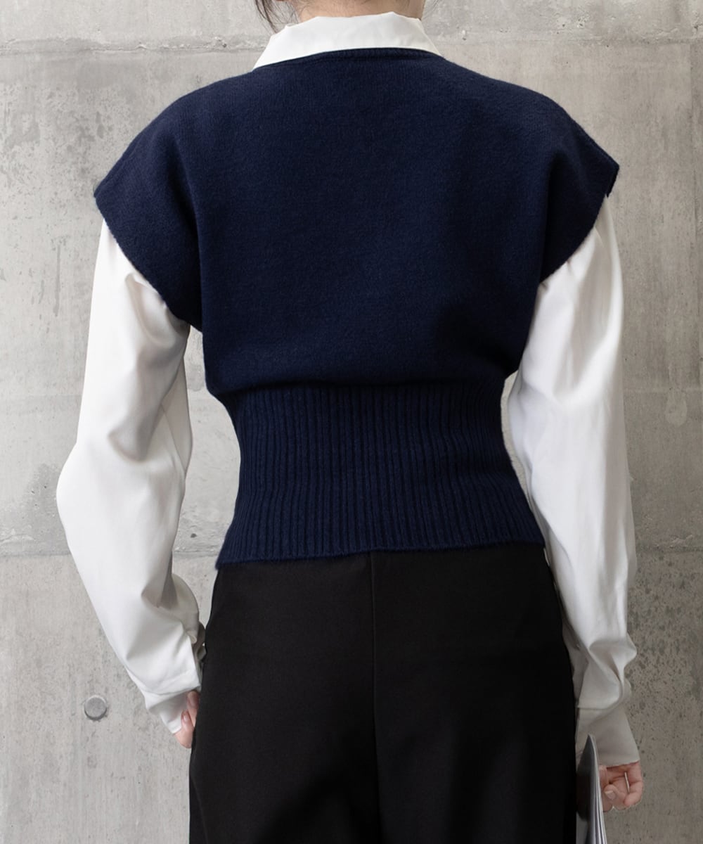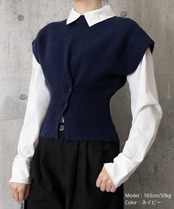 リブ切り替えとフロントボタンがアクセントになった上品なニットベスト。