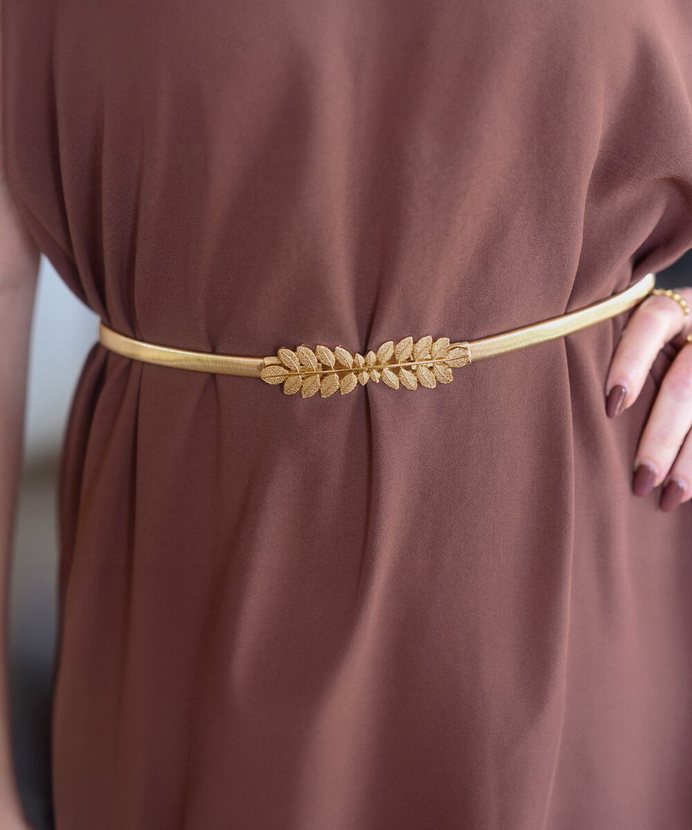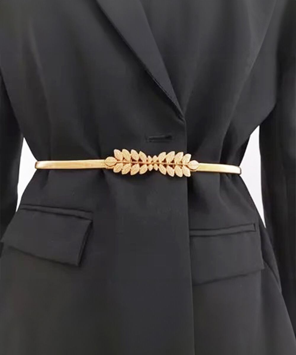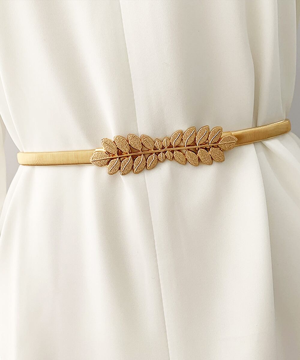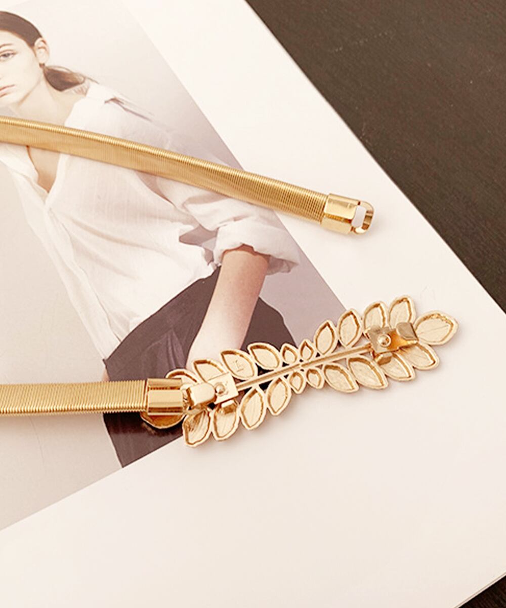 ウエストベルト レディース フィット 金属製ベルト 葉っぱモチーフ ウエストマーク 細見え ゴールドチェーンベルト 上品