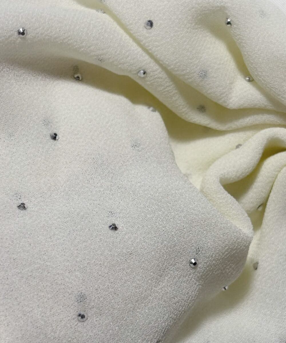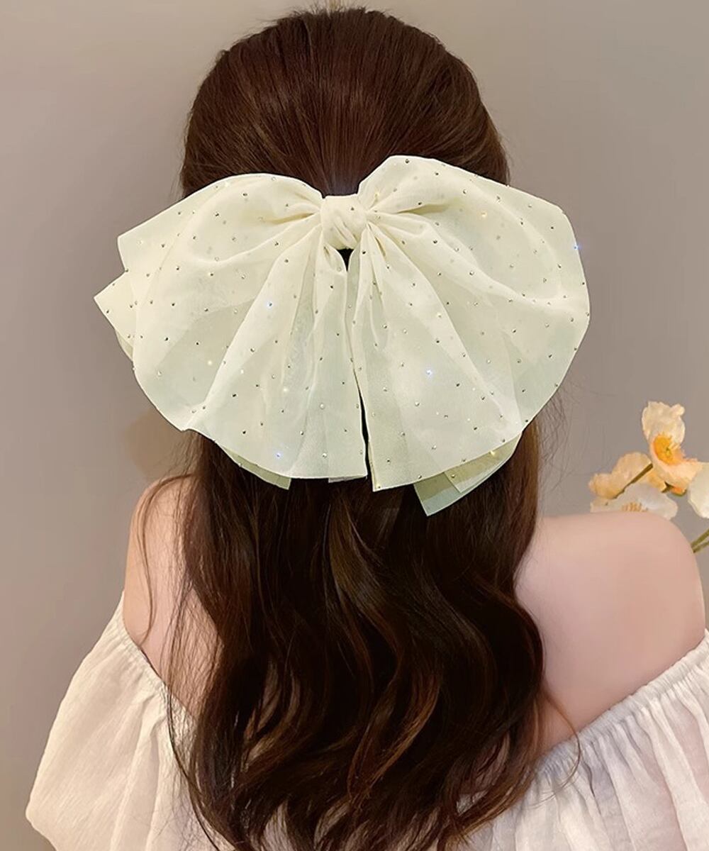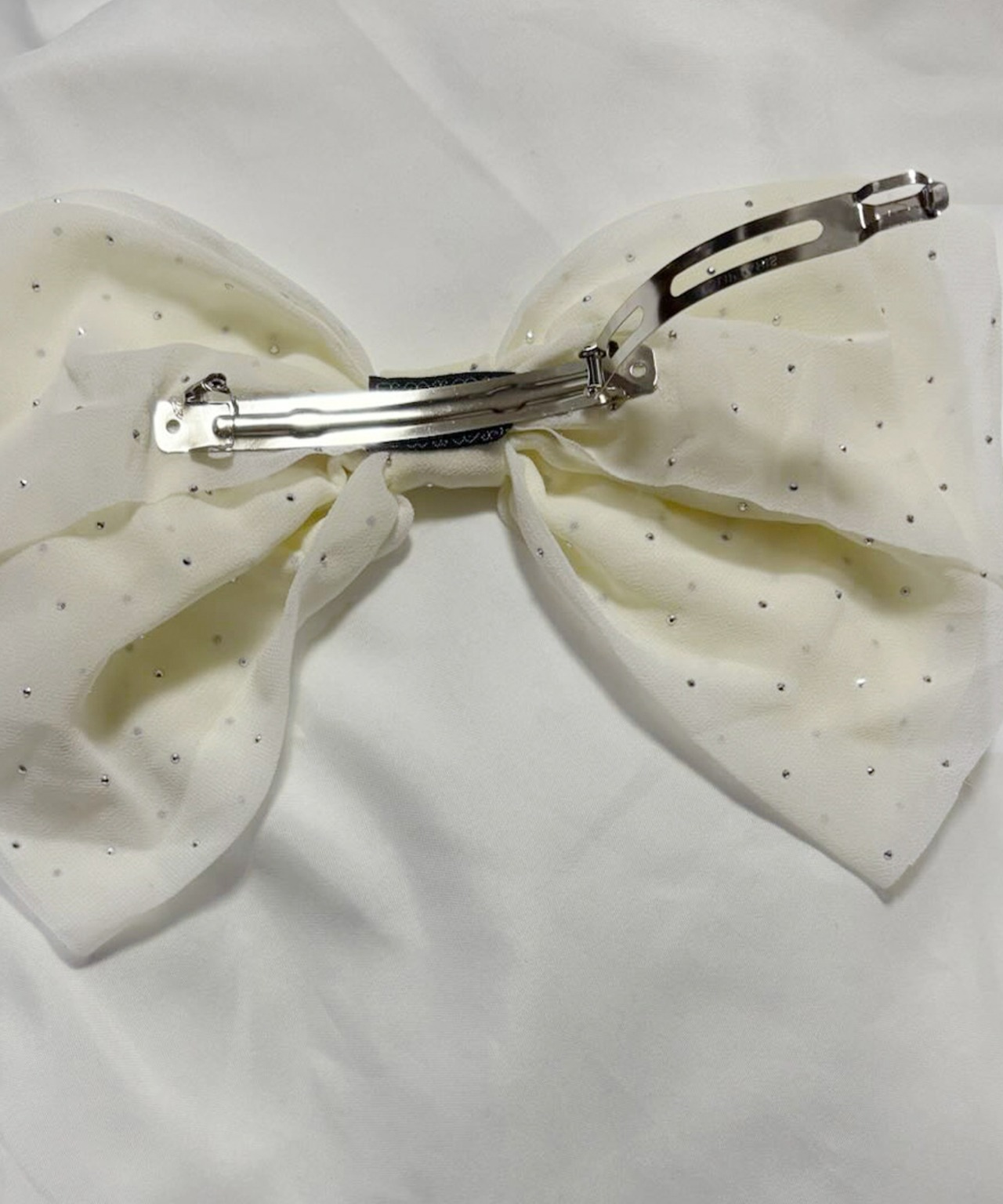 軽やかなシフォン生地に、さりげない輝きを添えた大きめリボンヘアアクセサリー。