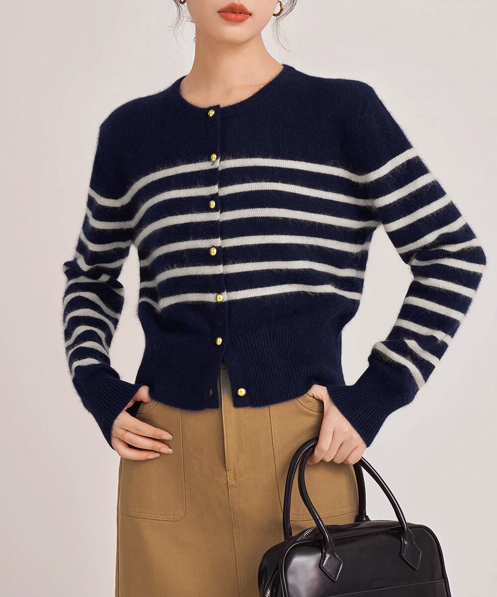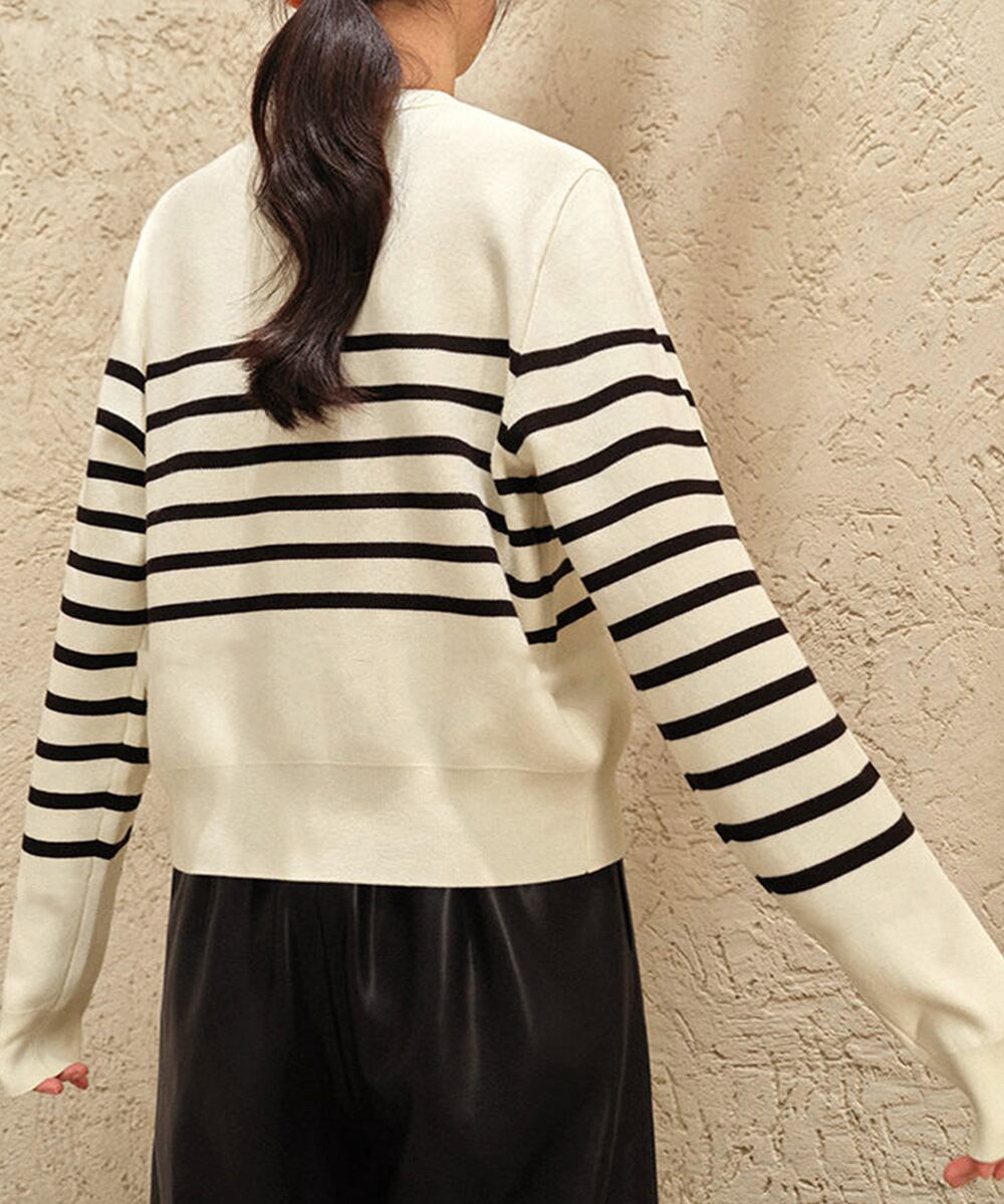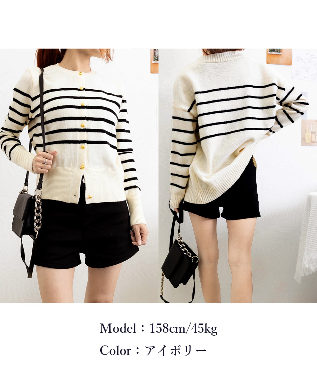 ボーダーとゴールドのボタンが特徴的なニットカーディガン。