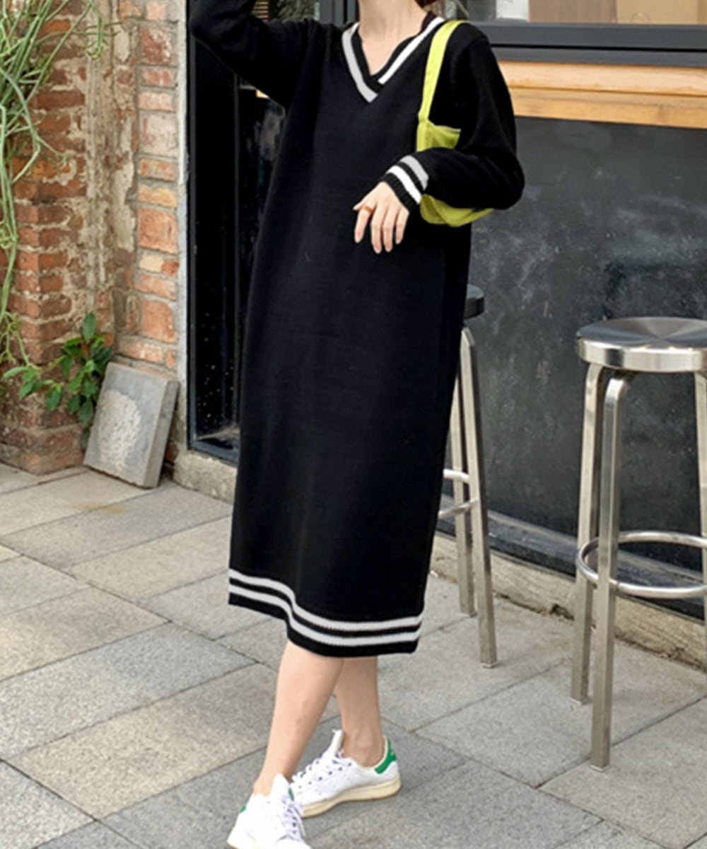 Vネック ワンピース おしゃれ 長袖ワンピース 体型カバー 着やせ きれいめカジュアル ゆったり Iラインワンピース韓国