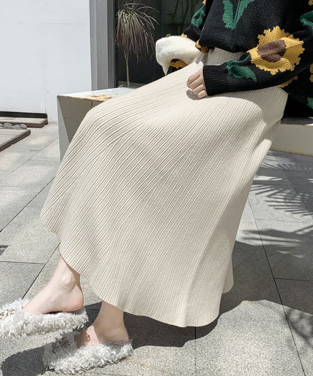 レディース Aラインスカート リブスカート ウエストゴム ハイウエスト ボトムス 体型カバー 大人可愛い 韓国風