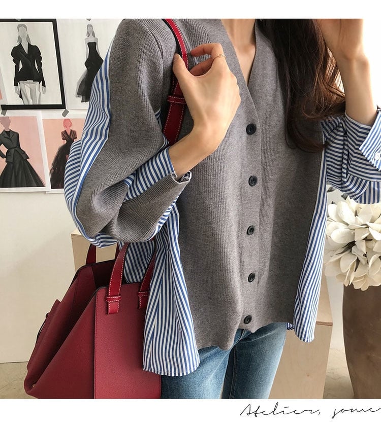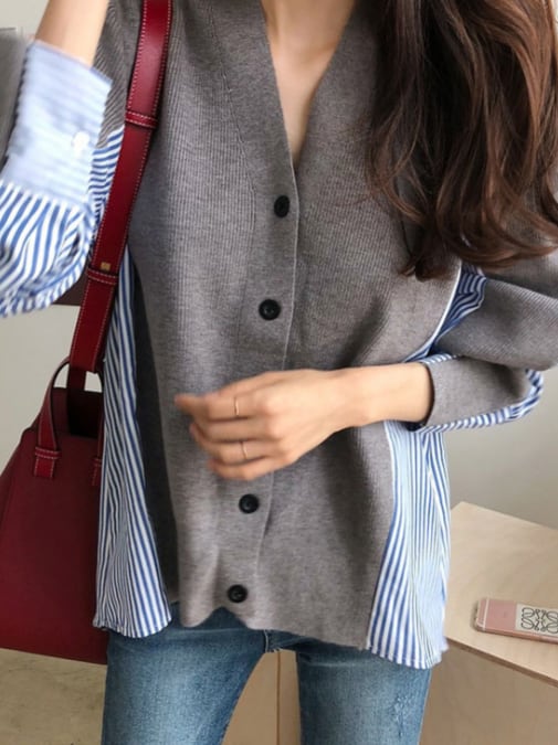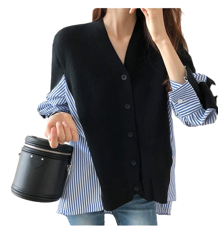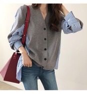 【海外からの取り寄せ】 秋冬新作 Vネック 異素材シャツカーディガン トップス きれいめ カジュアル ストライプ #[cardigan225_23800]【送料込み】【251003】