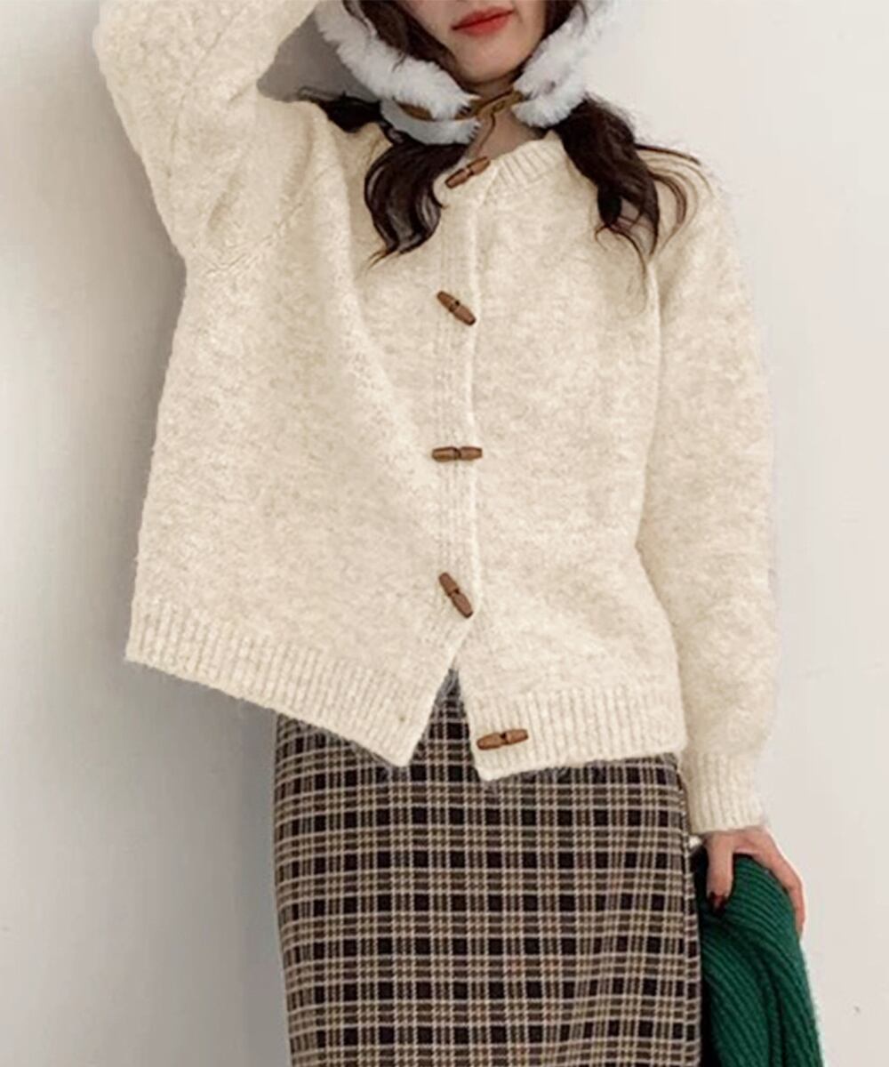 ソフトな風合いが魅力のトグルボタン付きニットカーディガン。
