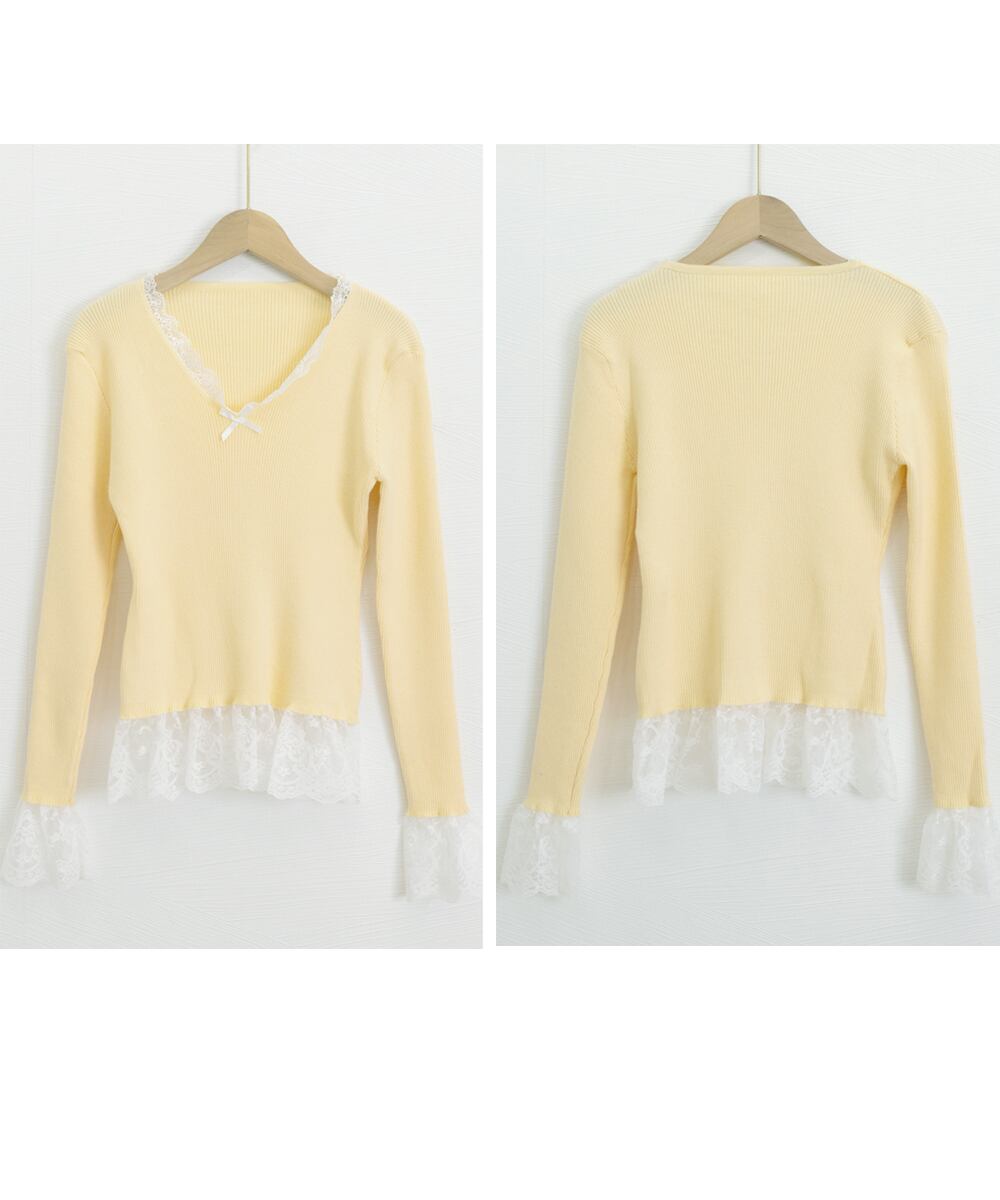 すっきりとしたVネックラインにレースをあしらったフェミニンなニットトップス。