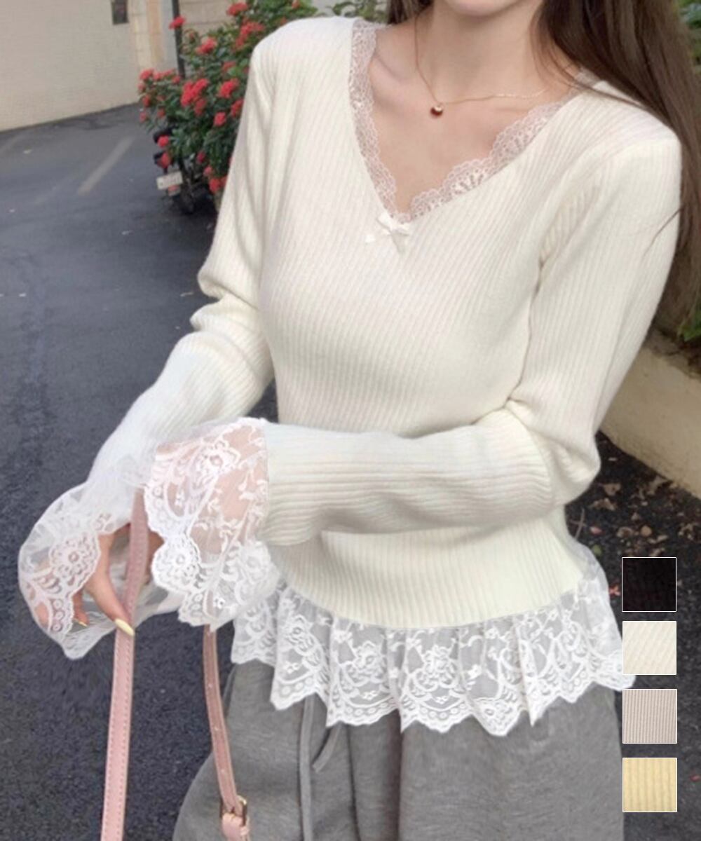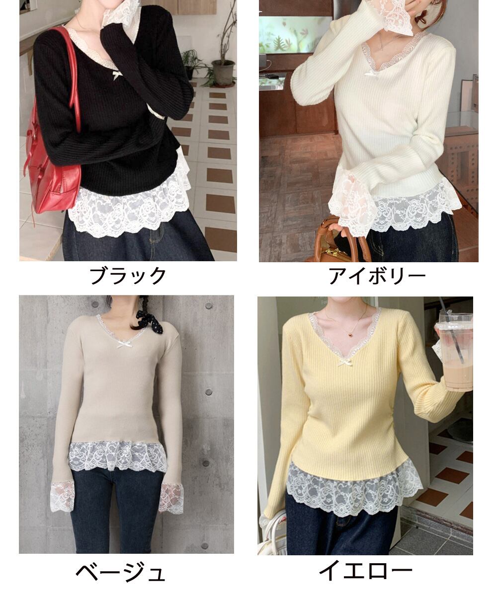 【日本倉庫からの発送】 ニットトップス レース切替え Vネック服 #[77ZHYI-001_21100]【送料込み】【251022】