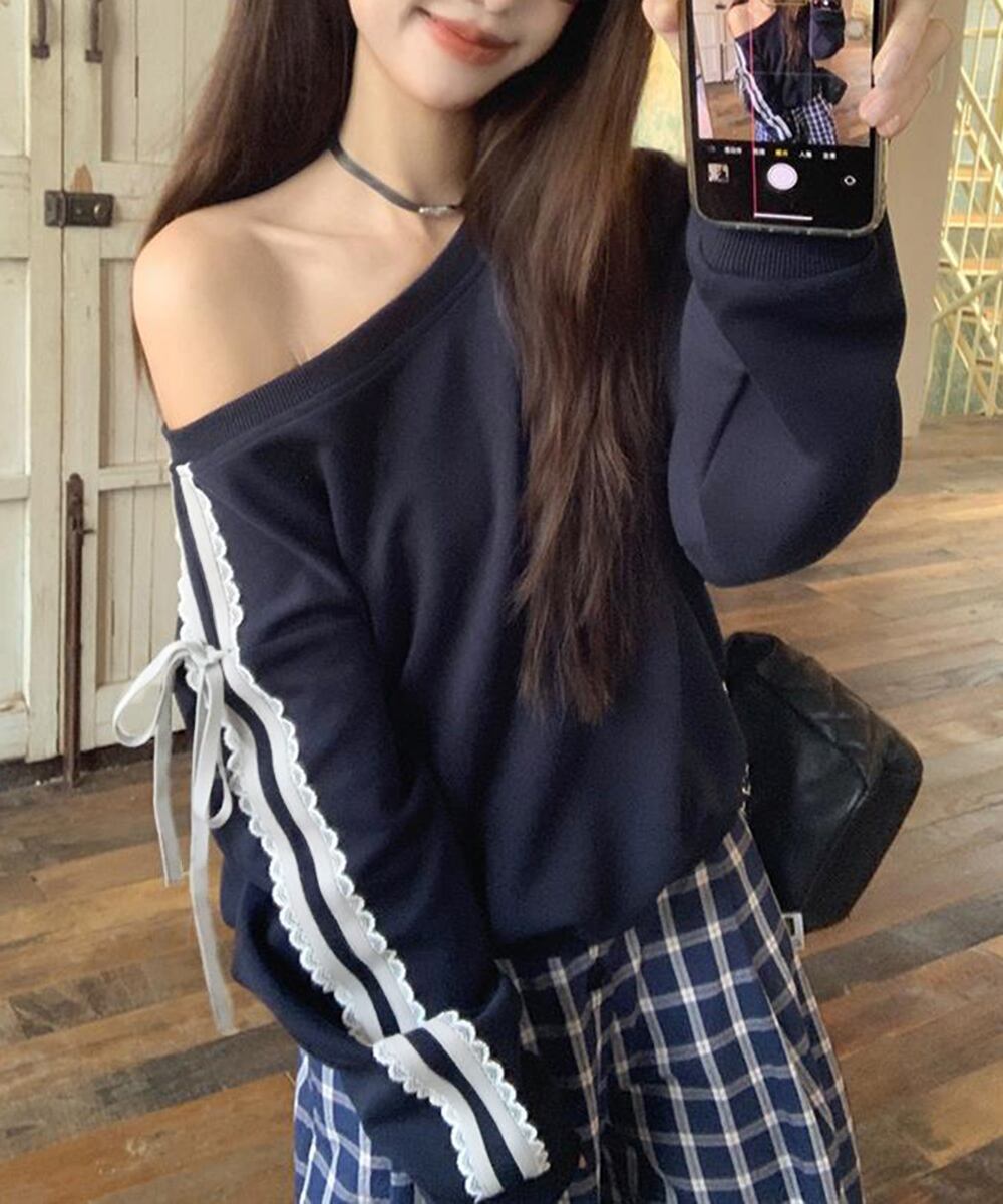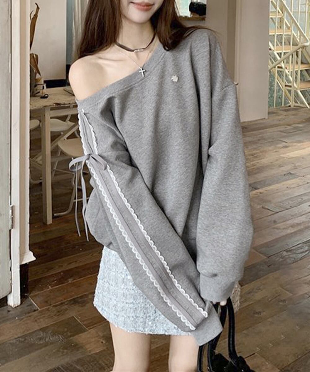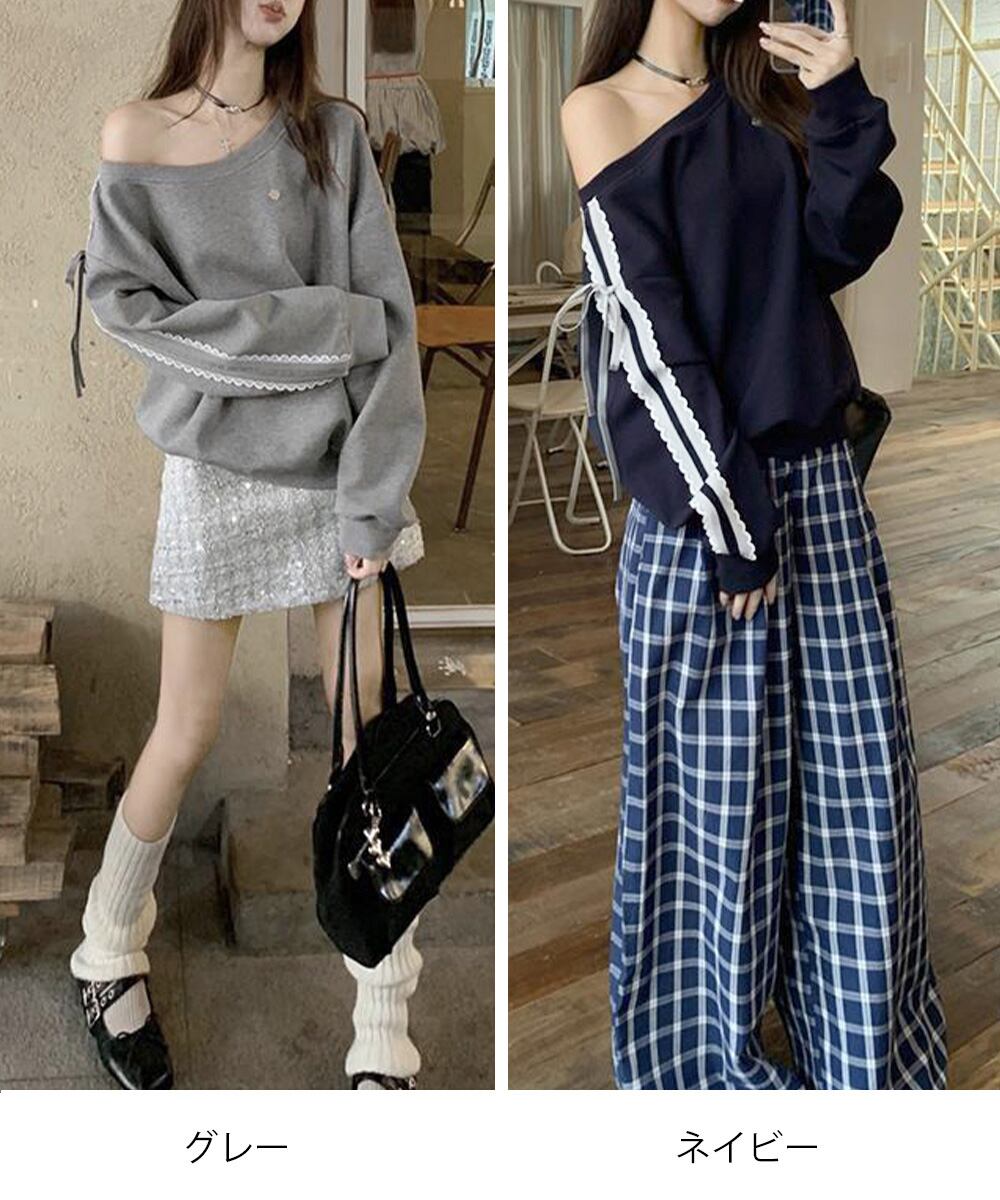 【日本倉庫からの発送】 オフショルダースウェット長袖レースリボン #[90CHENXINI-027_26100]【送料込み】【260115】