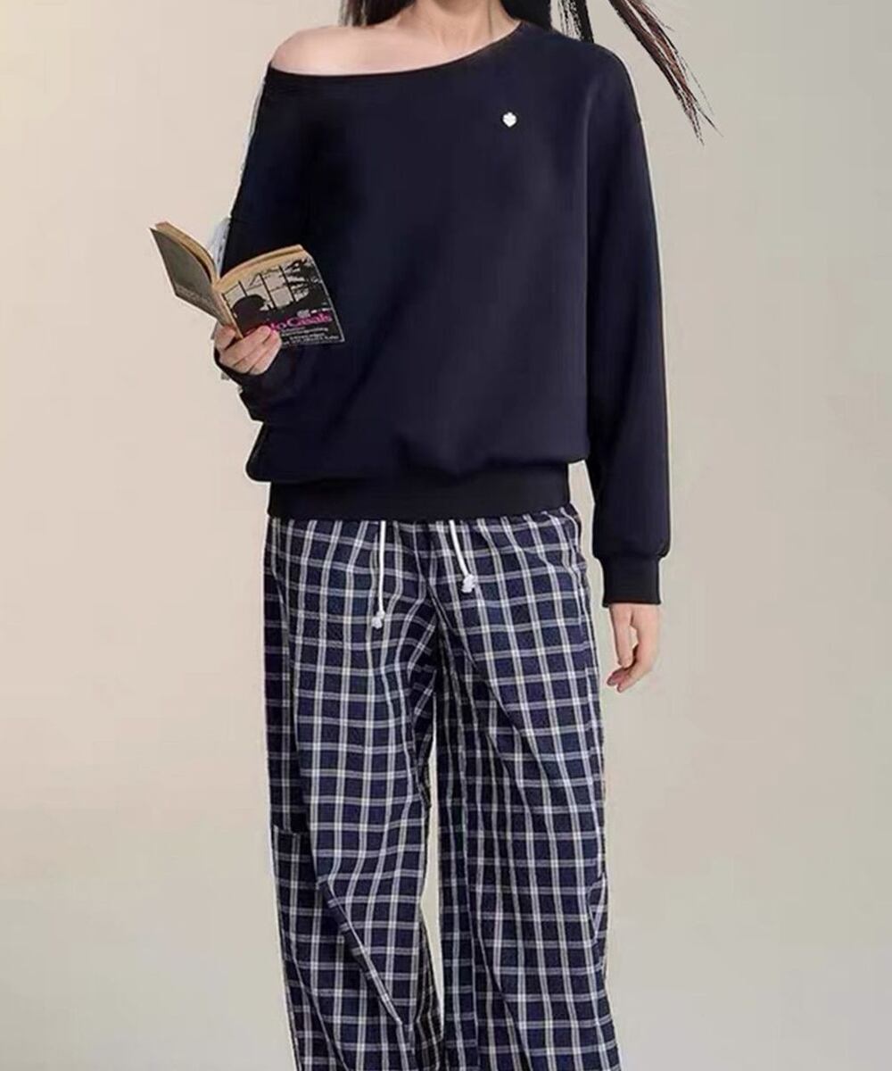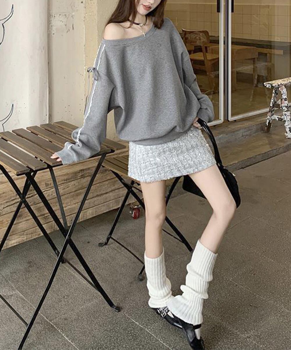 韓国風のカジュアルさとフェミニンさを兼ね備えたレディースオフショルダー長袖スウェット。