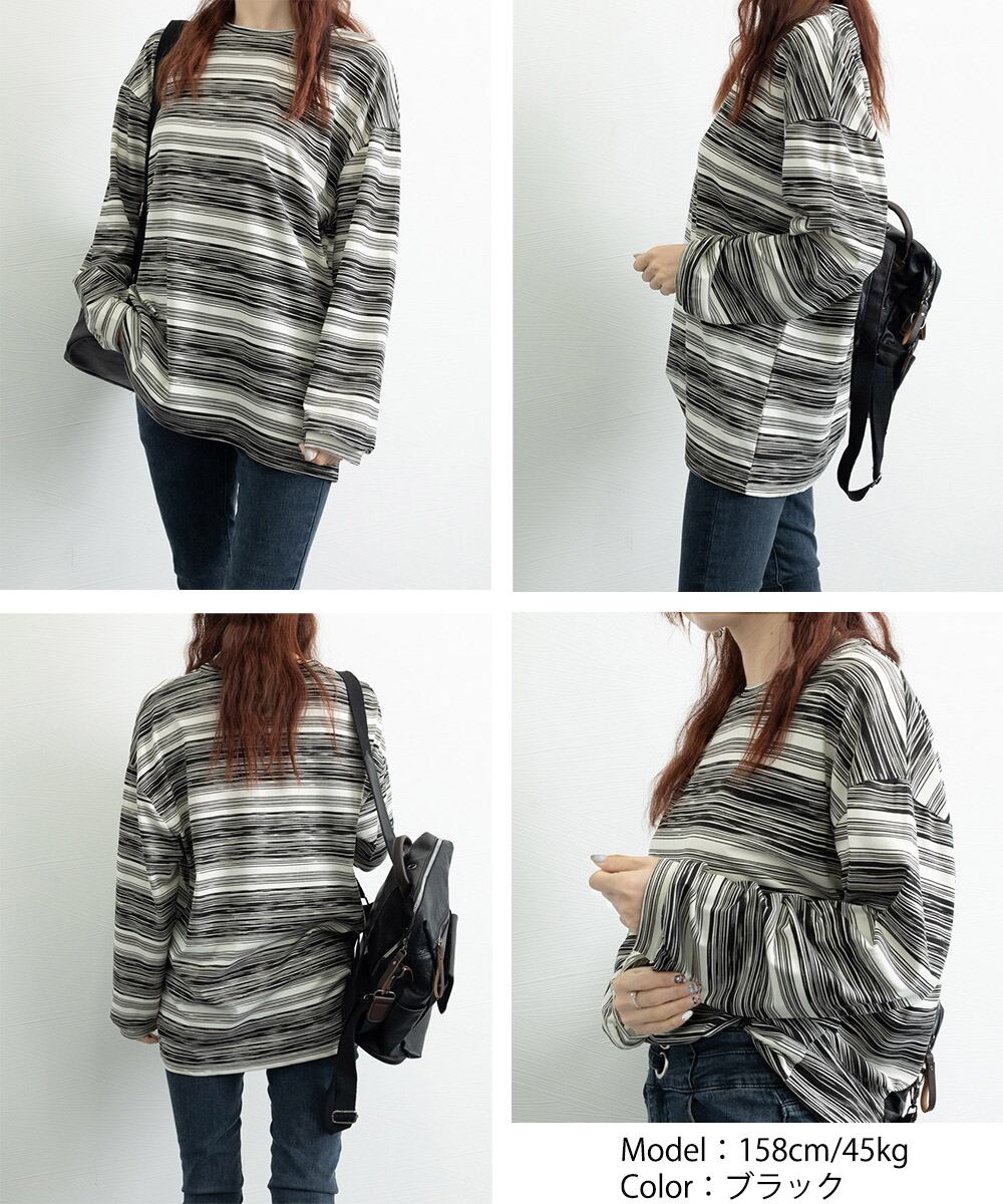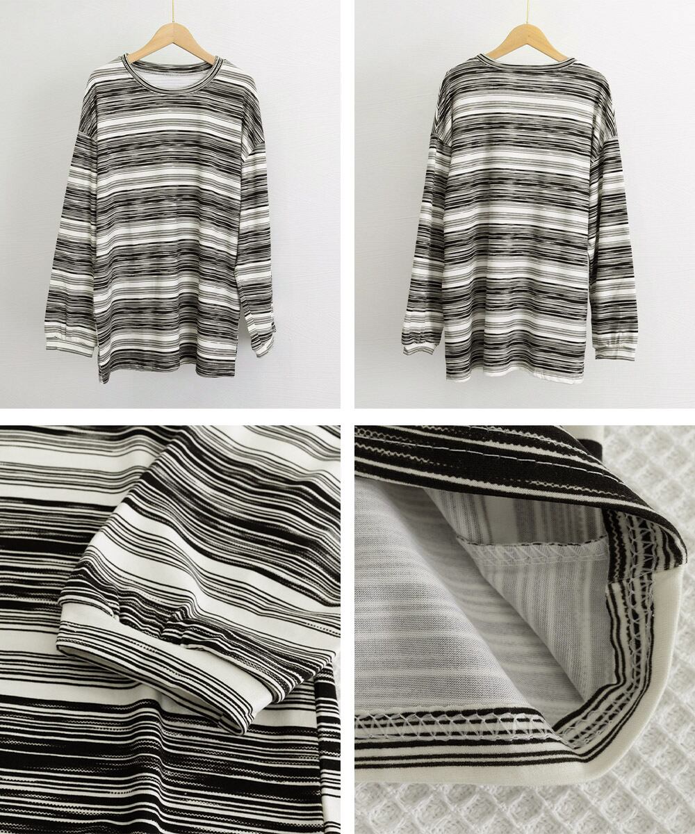 シンプルで洗練された学院風スタイルのマルチボーダー柄の長袖Tシャツ。