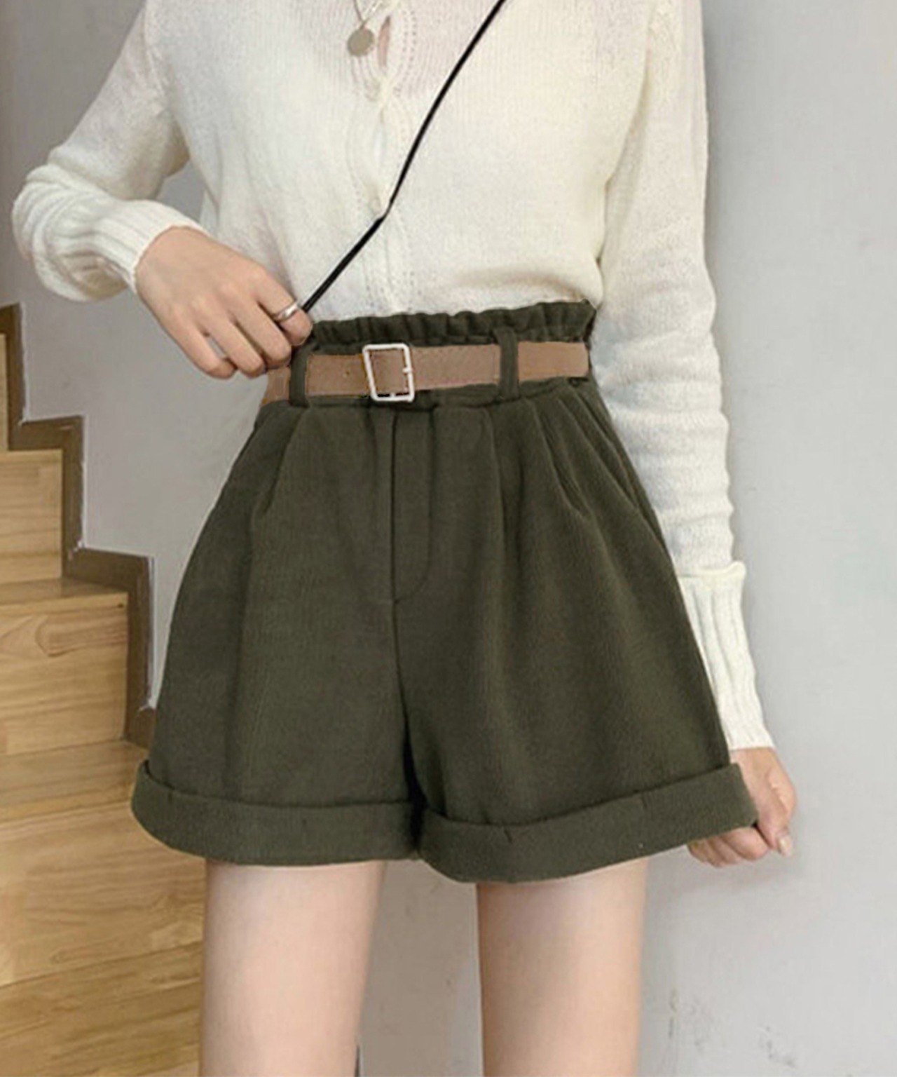 ハイウエストデザインとAラインシルエットで、脚長印象とスタイルアップを引き立てるベルト付きコーデュロイショートパンツ。