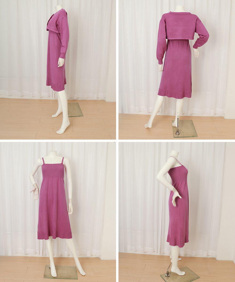 ショート丈カーディガンとリブニットワンピースの2点セットで、着回し力抜群。