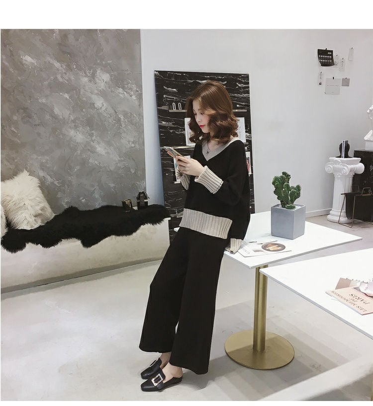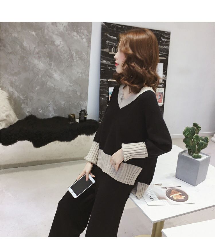 【海外からの取り寄せ】2021秋冬新作 レディース 上下セット バイカラー Vネック ニット セットアップ ワイドパンツ セーター #[set040_17800]【送料込み】【251012】