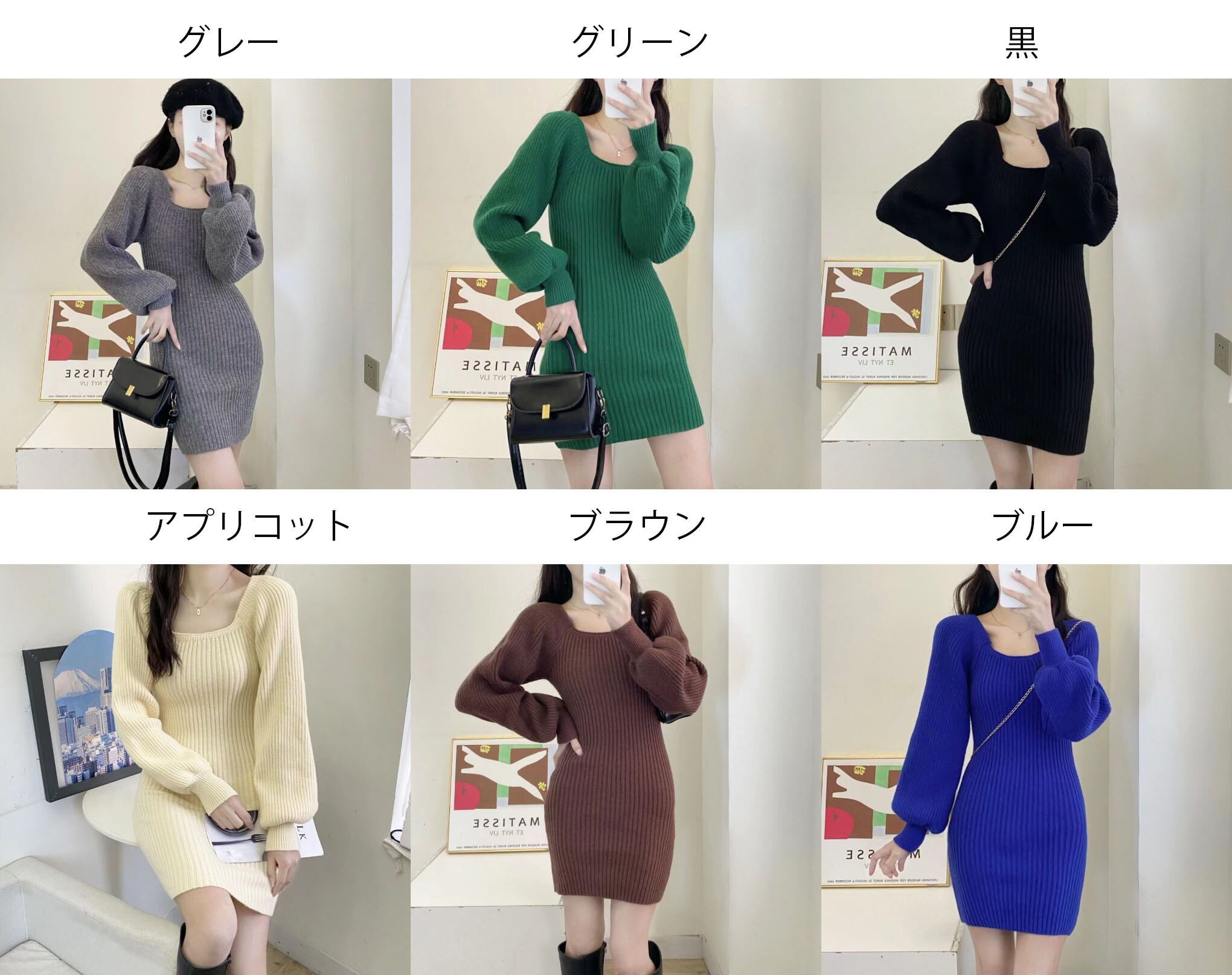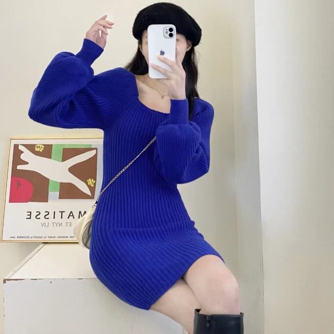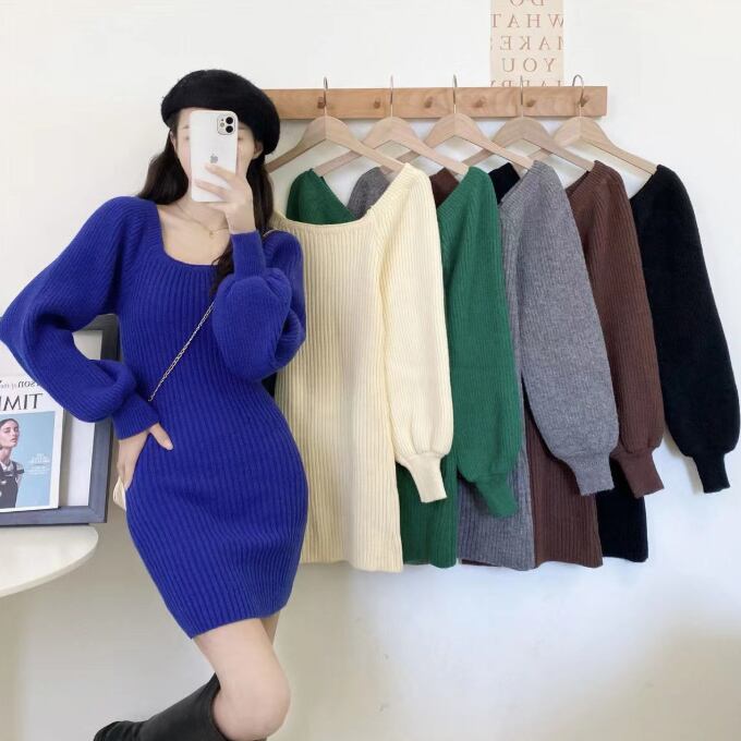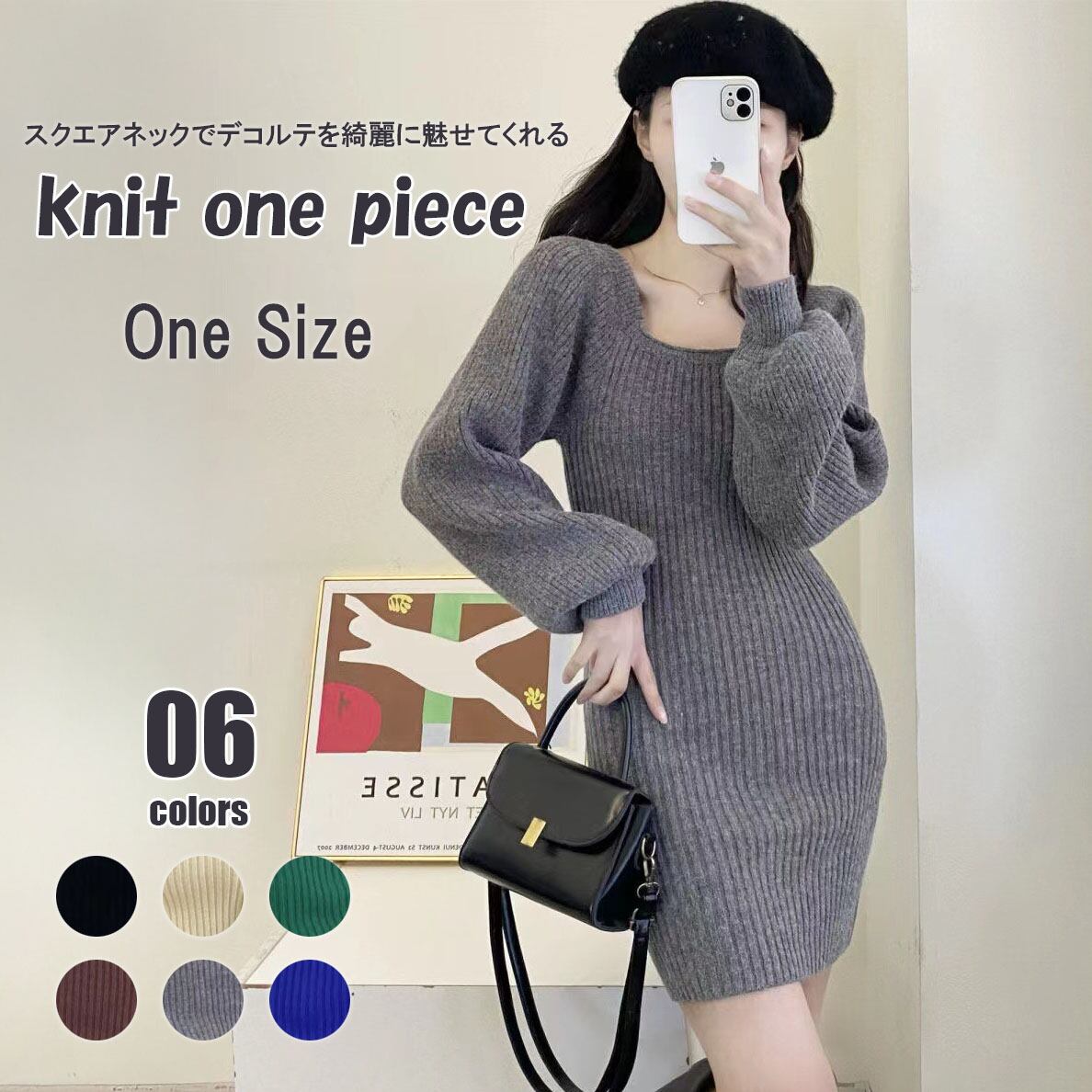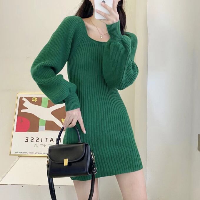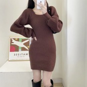【海外からの取り寄せ】レディース 秋冬 ニットワンピース スクエアネックリブニット ミニ丈 パフスリーブ 無地 シンプル 韓国風 #[onepiece446_25800]【送料込み】【251102】