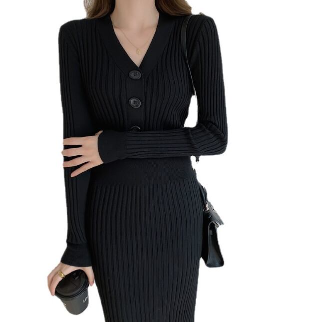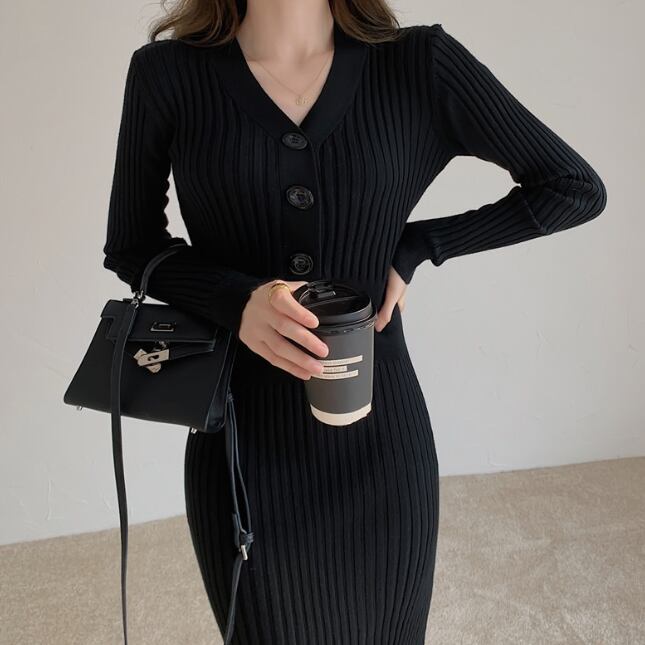 【海外からの取り寄せ】2025新作 レディース ワンピース ロング丈 ニット リブVネックニット ミディアム丈 長袖 大人っぽい #[onepiece445_22800]【送料込み】【251102】