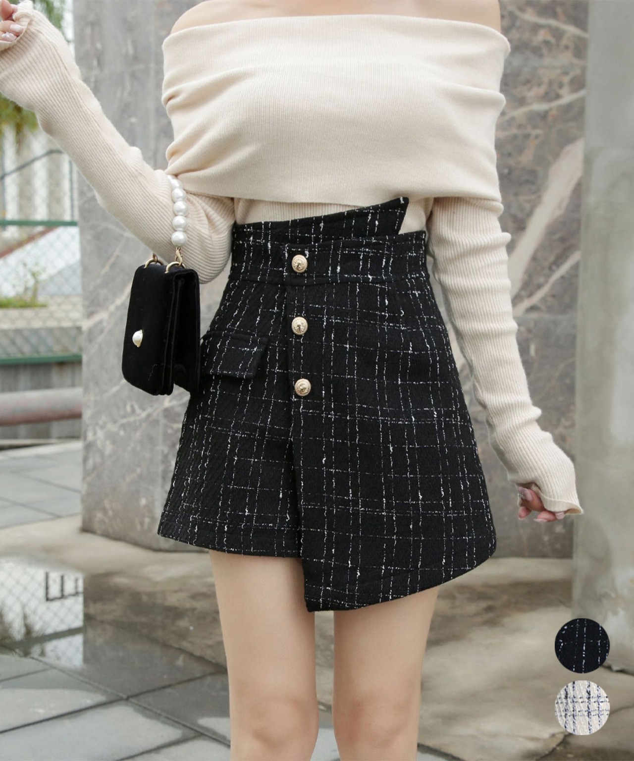 ツイード調のチェック柄が上品な印象を与えるハイウエストのラップ風ミニスカパン。
