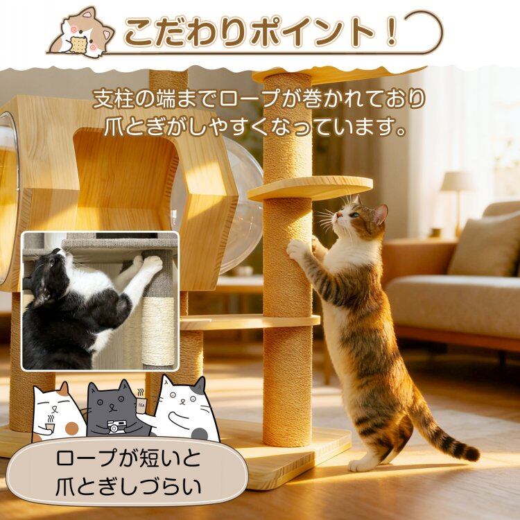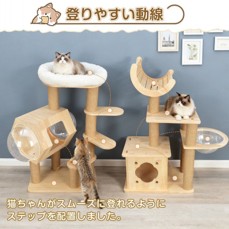 キャットタワー 木製 天然 天然木 据え置き 低め 置き型 多頭飼い 宇宙船 クリアボウル 透明 #[pt103_90400]【送料込み】【251103】