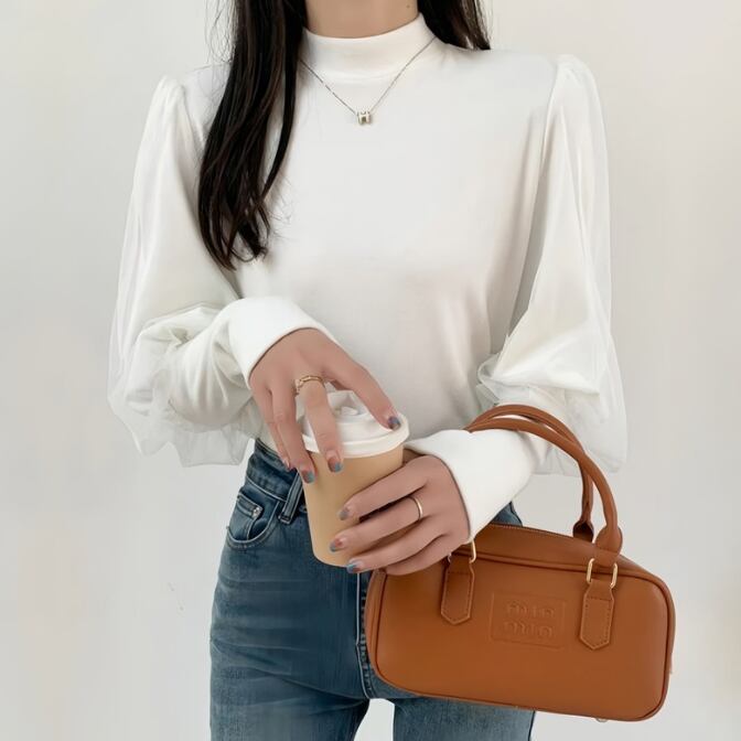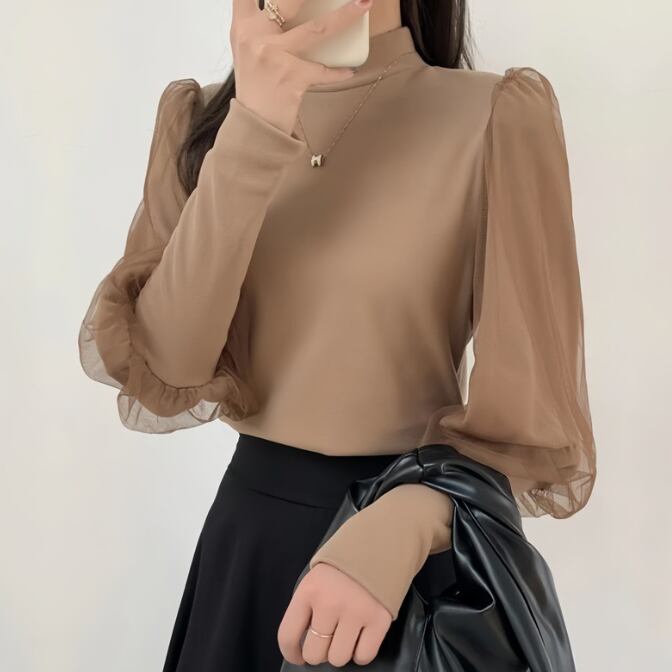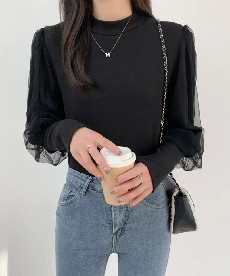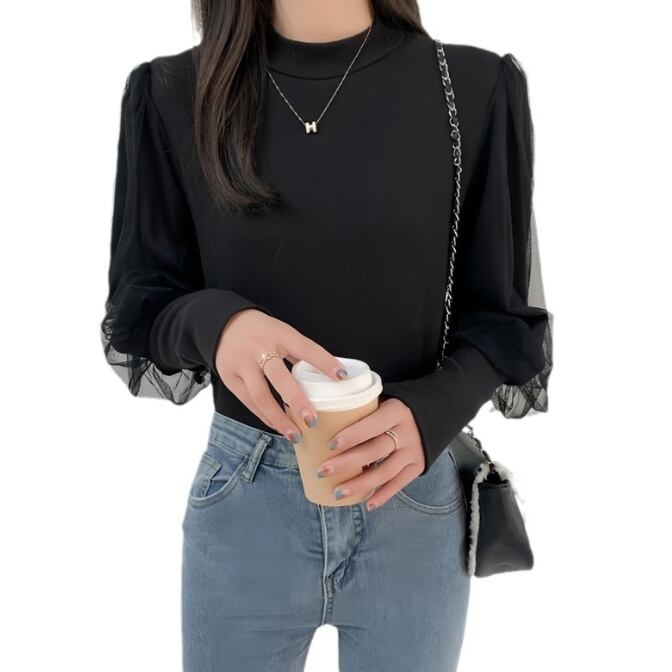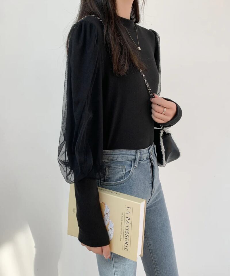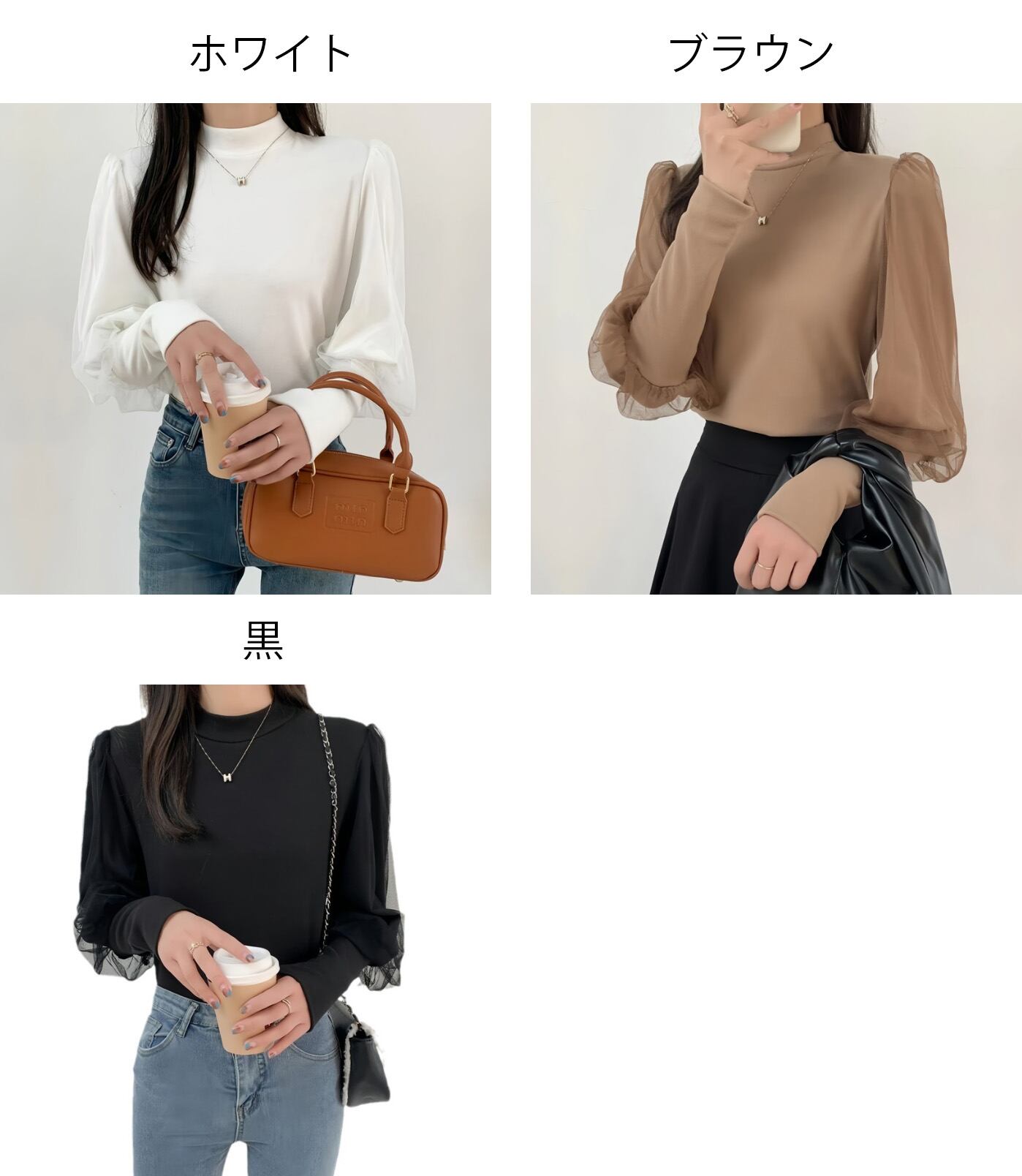 【海外からの取り寄せ】2025新作 レディース ブラウス ハイネックトップス 伸縮 ボリューム袖 異素材MIX スリーブ #[tops723_23800]【送料込み】【251128】