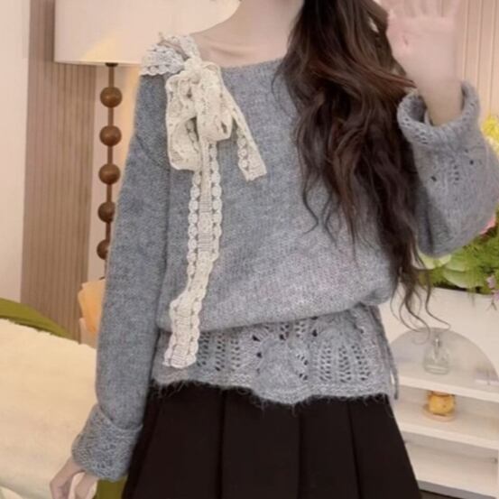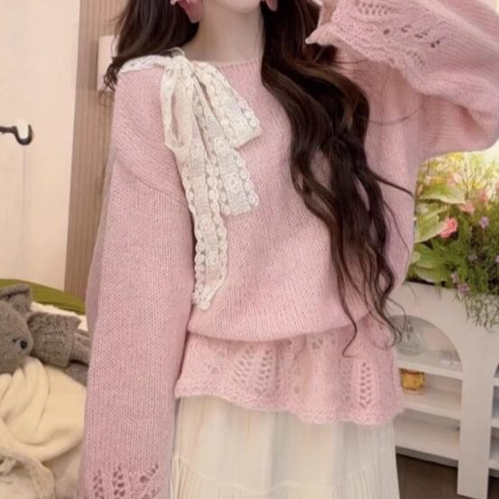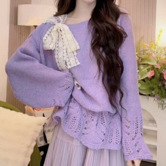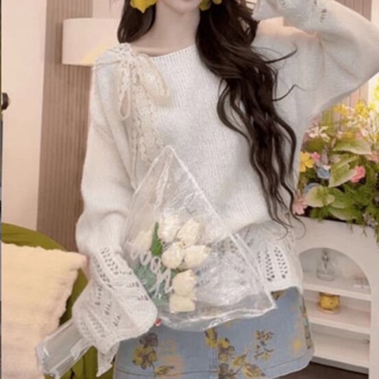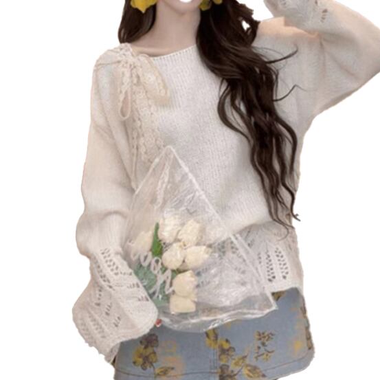 【海外からの取り寄せ】 2025新作 レディース ブラウス リボンモチーフ ニットチュニック セーター 透かし編み #[tops718_19800]【送料込み】【251128】
