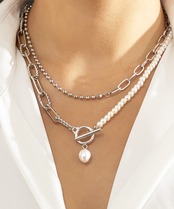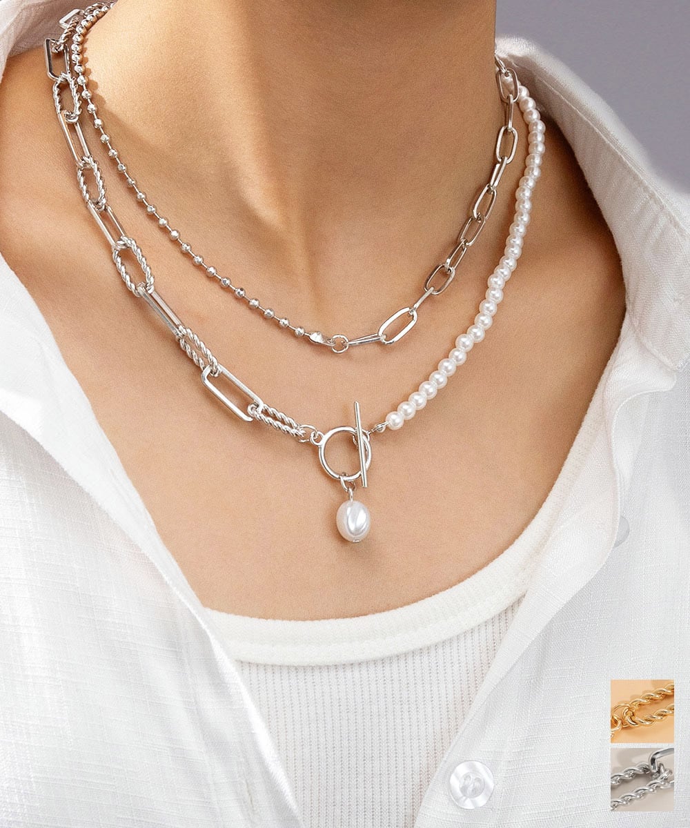 上品な小粒パールと存在感のある太めチェーンが調和し、スタイルに洗練された印象を添える。