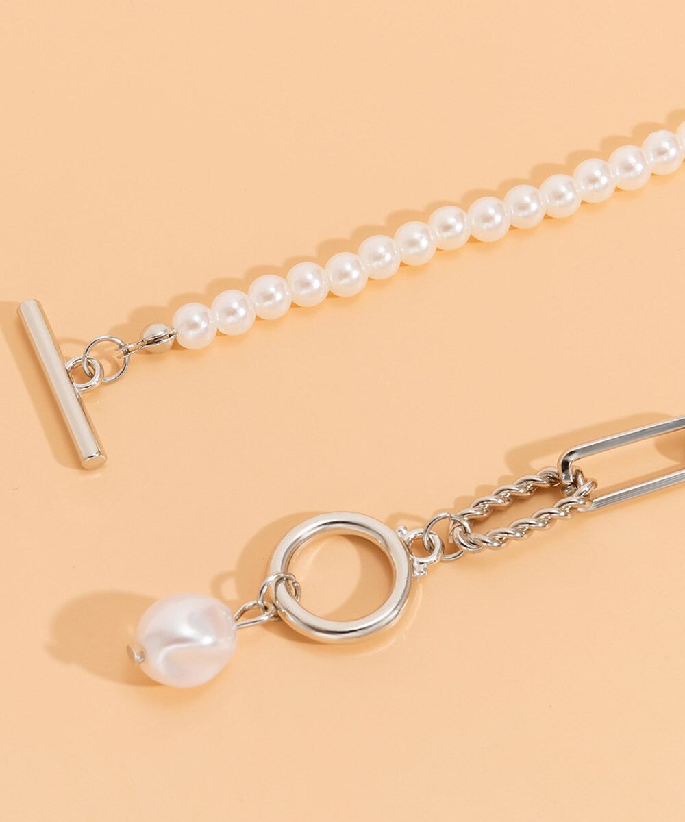 異素材を組み合わせたアシンメトリーデザインのパール×チェーンネックレス。