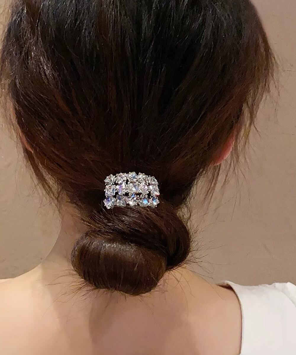 きらめくビジューが髪に華やかさをプラスし、結ぶだけで上品な印象に仕上げてくれる。