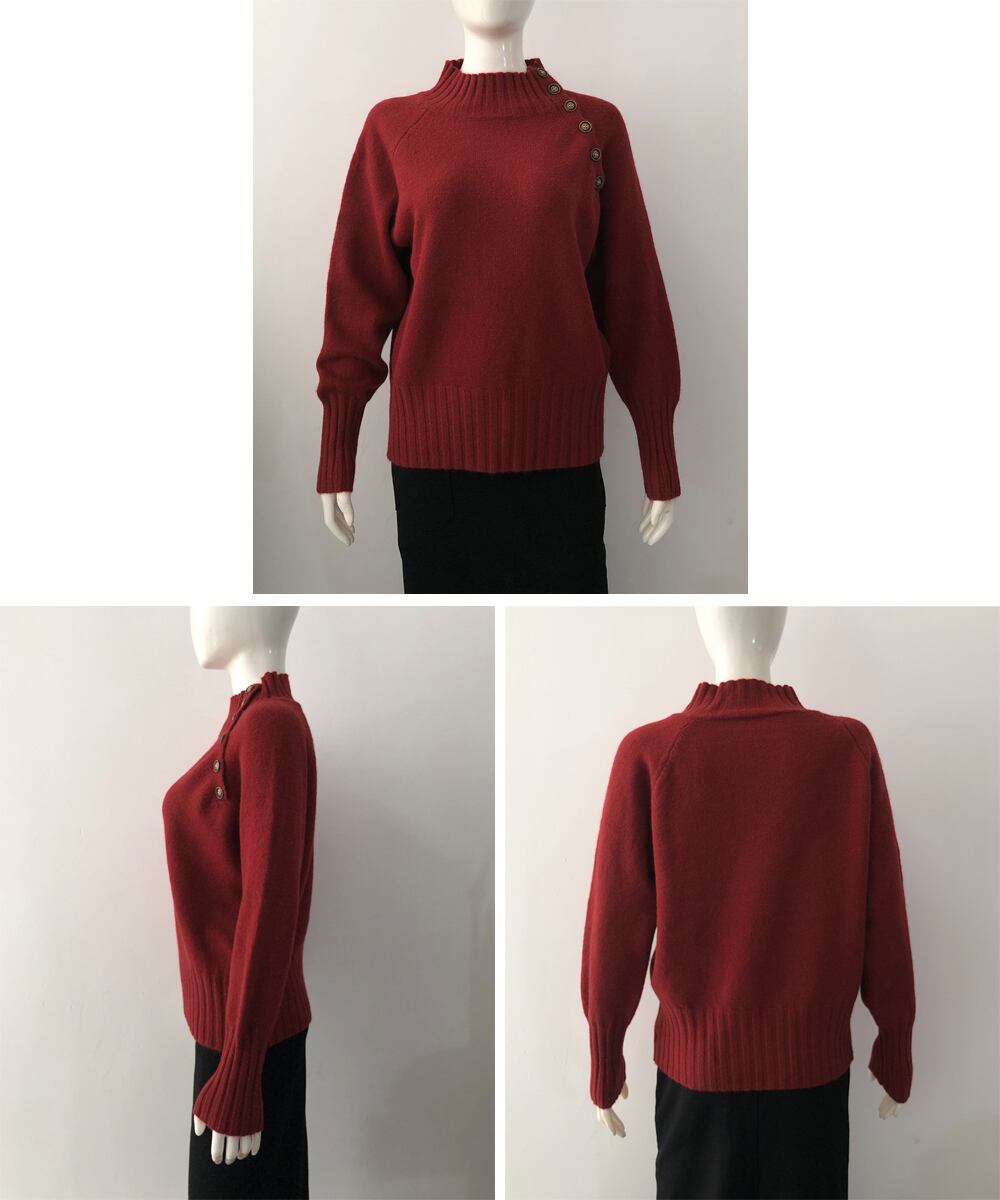 肩から首元にかけて並んだボタンデザインがアクセントになり、シンプルながらも上品な印象を与える。