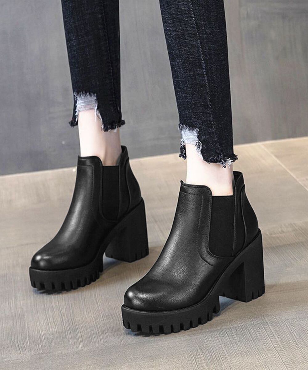 秋冬靴おしゃれ大人 痛くない厚底ブーツ 太ヒール ブーツ黒