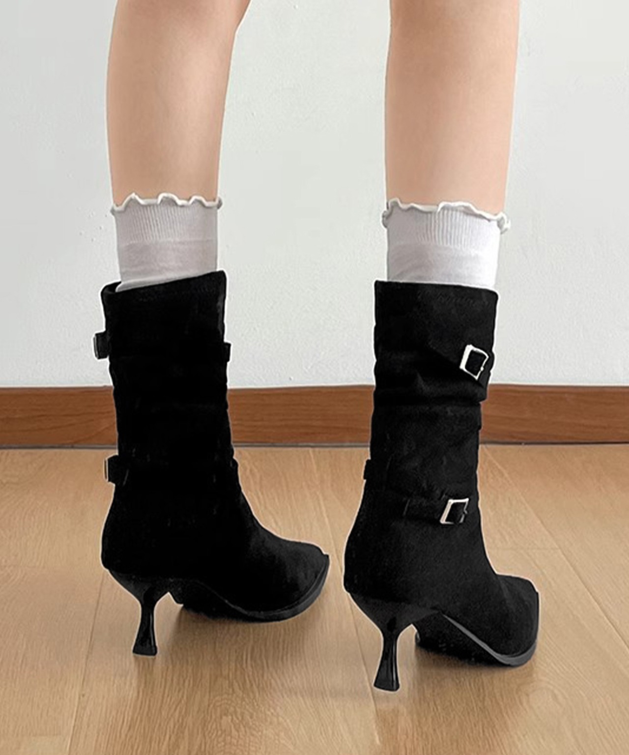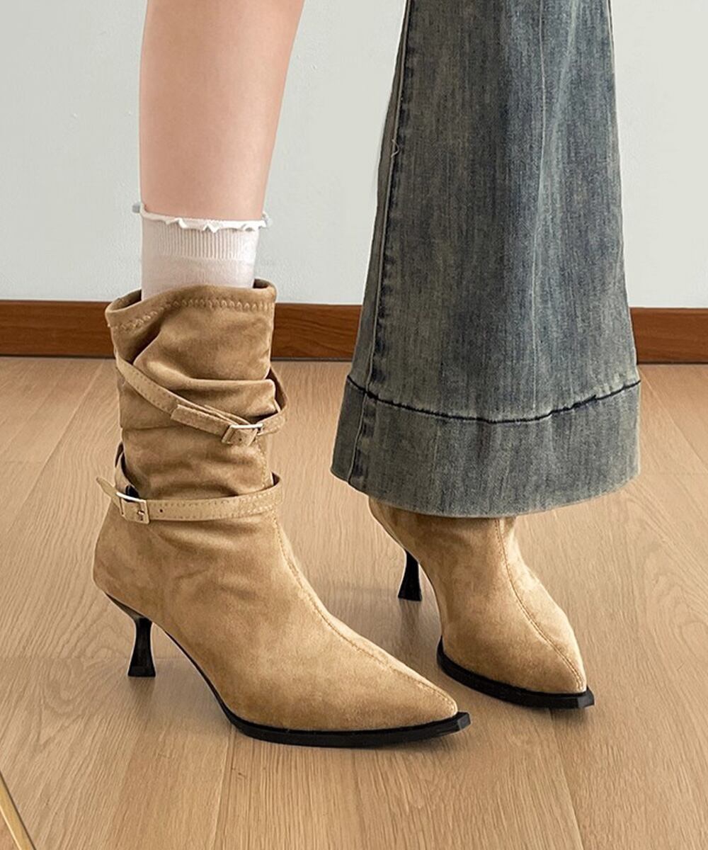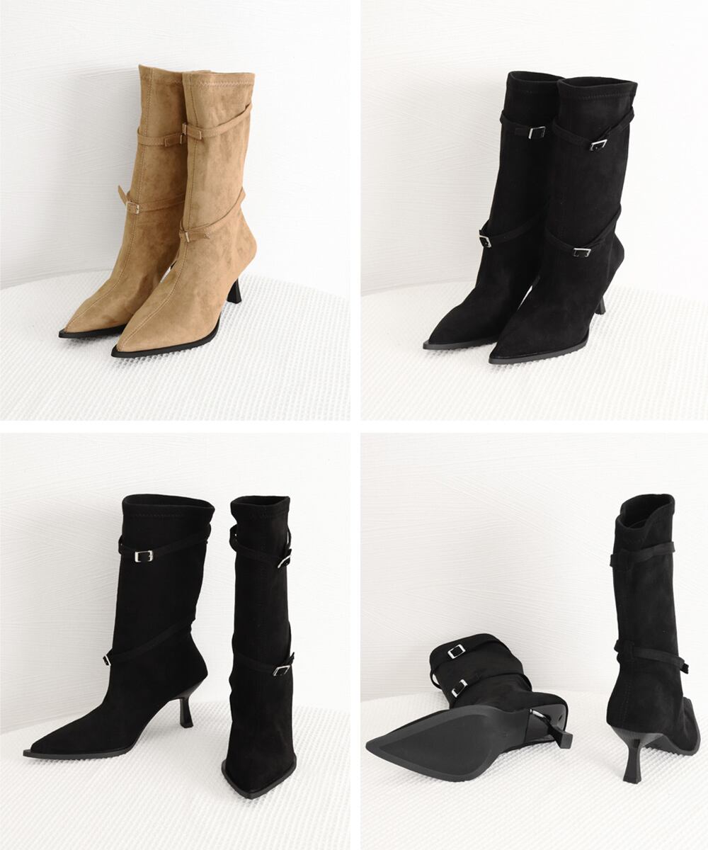 しなやかなスエード素材に、中筒部分の細身ベルトが上品さを添えるミドルブーツ。