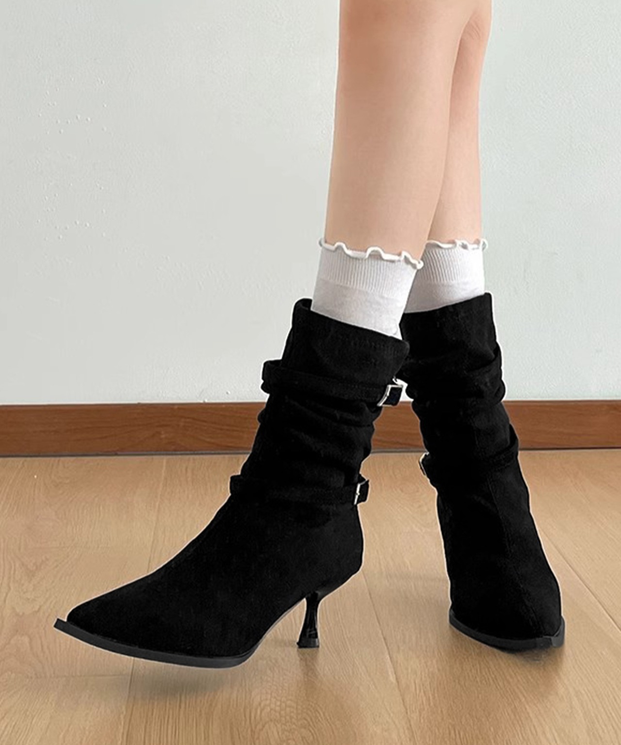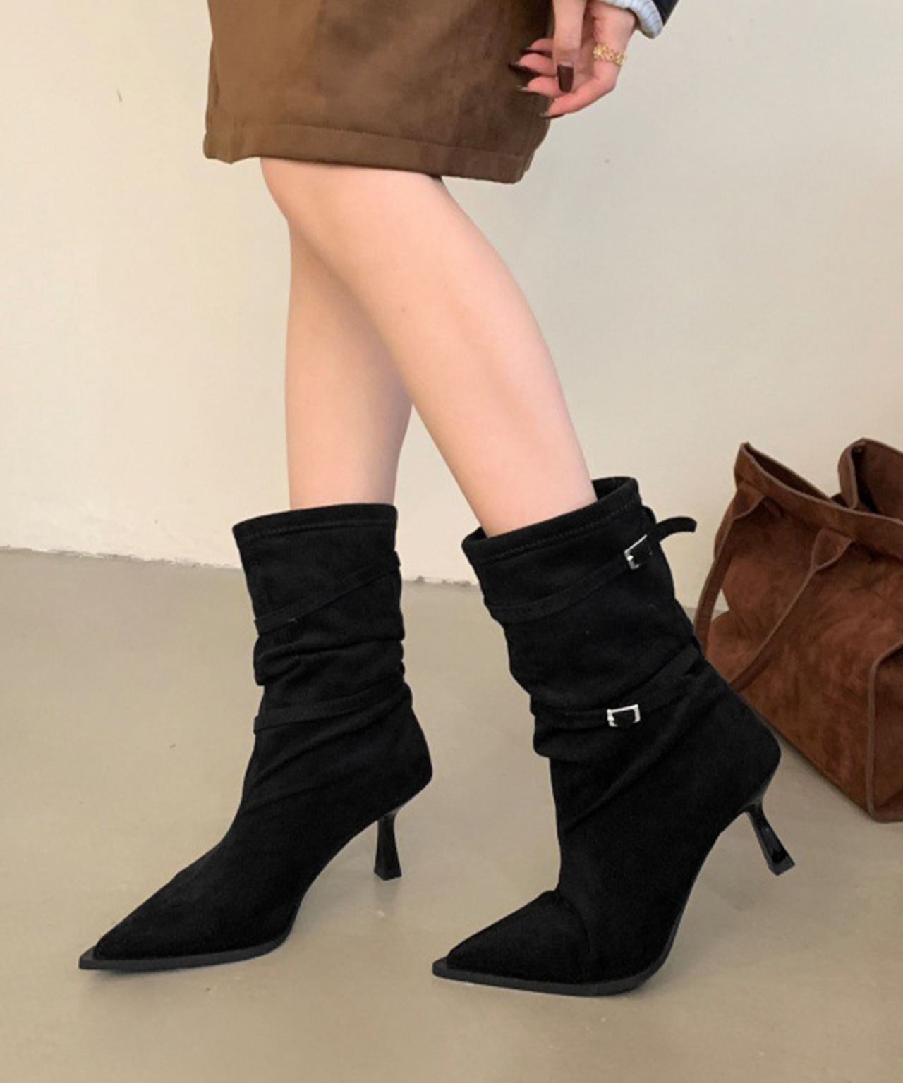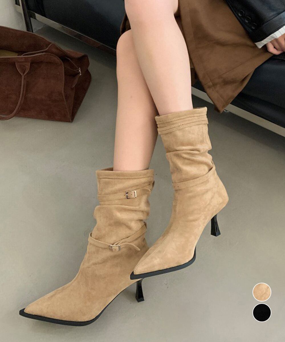 しなやかなスエード素材に、中筒部分の細身ベルトが上品さを添えるミドルブーツ。