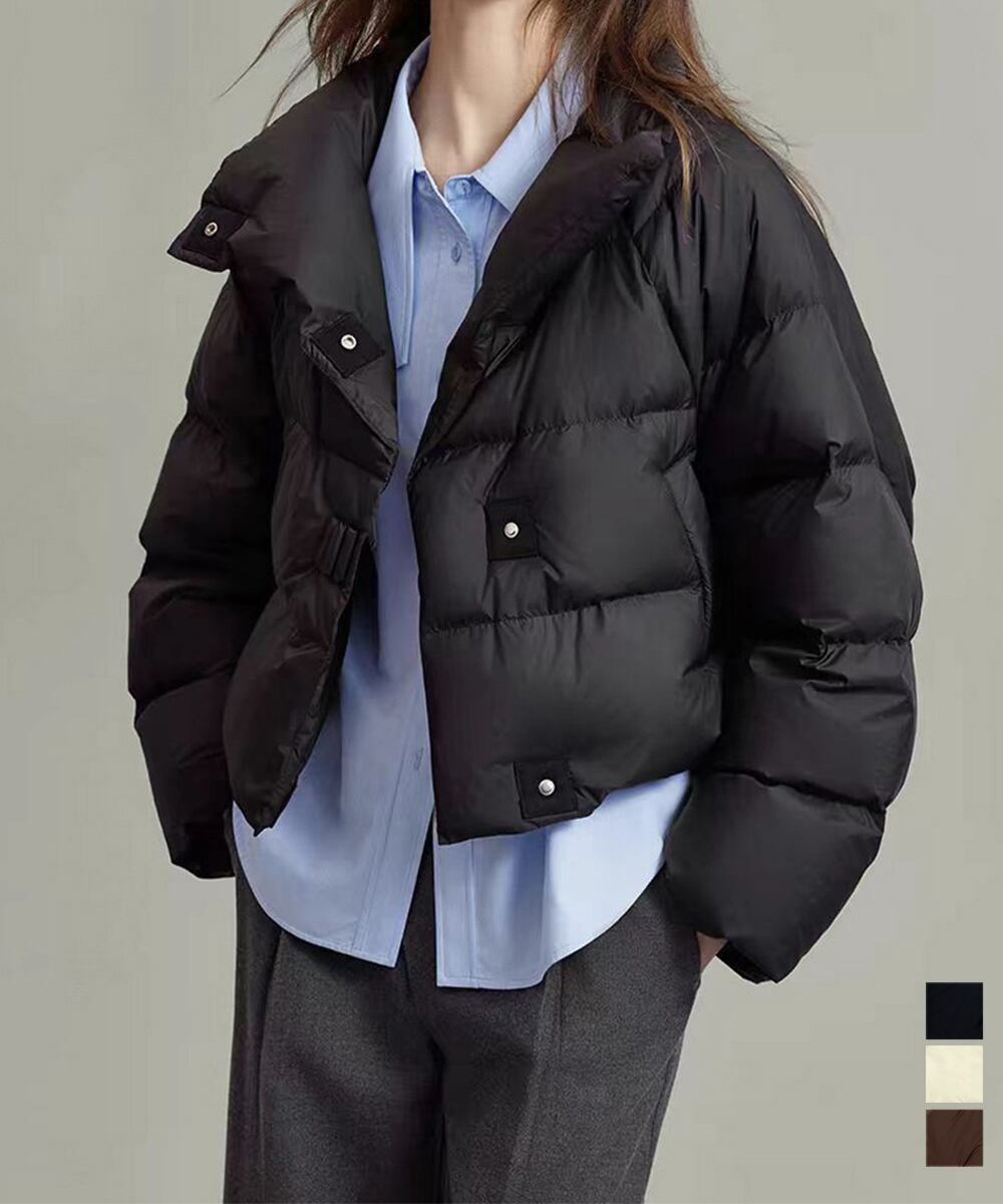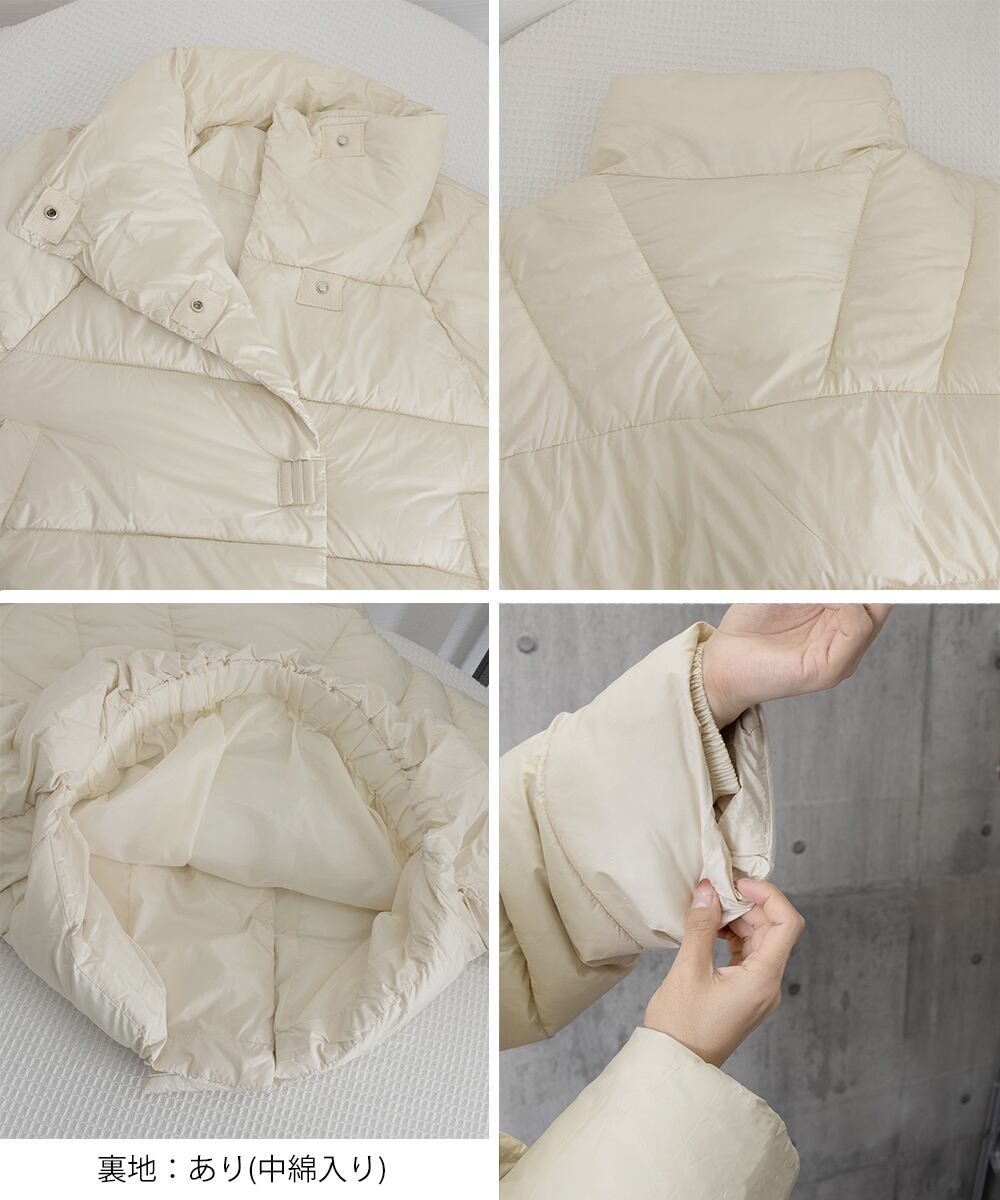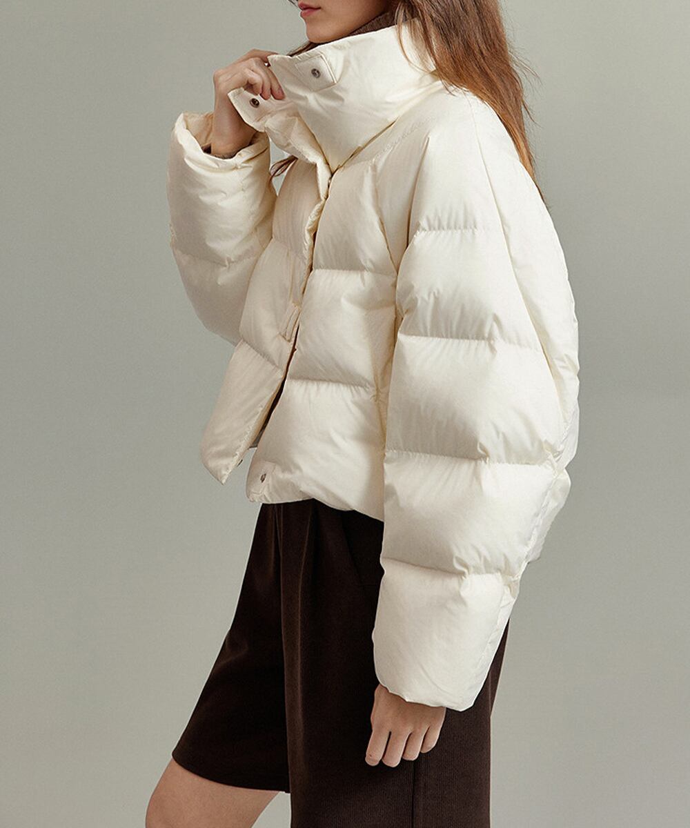 季節感たっぷりの、ボリューム感のあるスタンドカラーのエコダウンショートブルゾン。