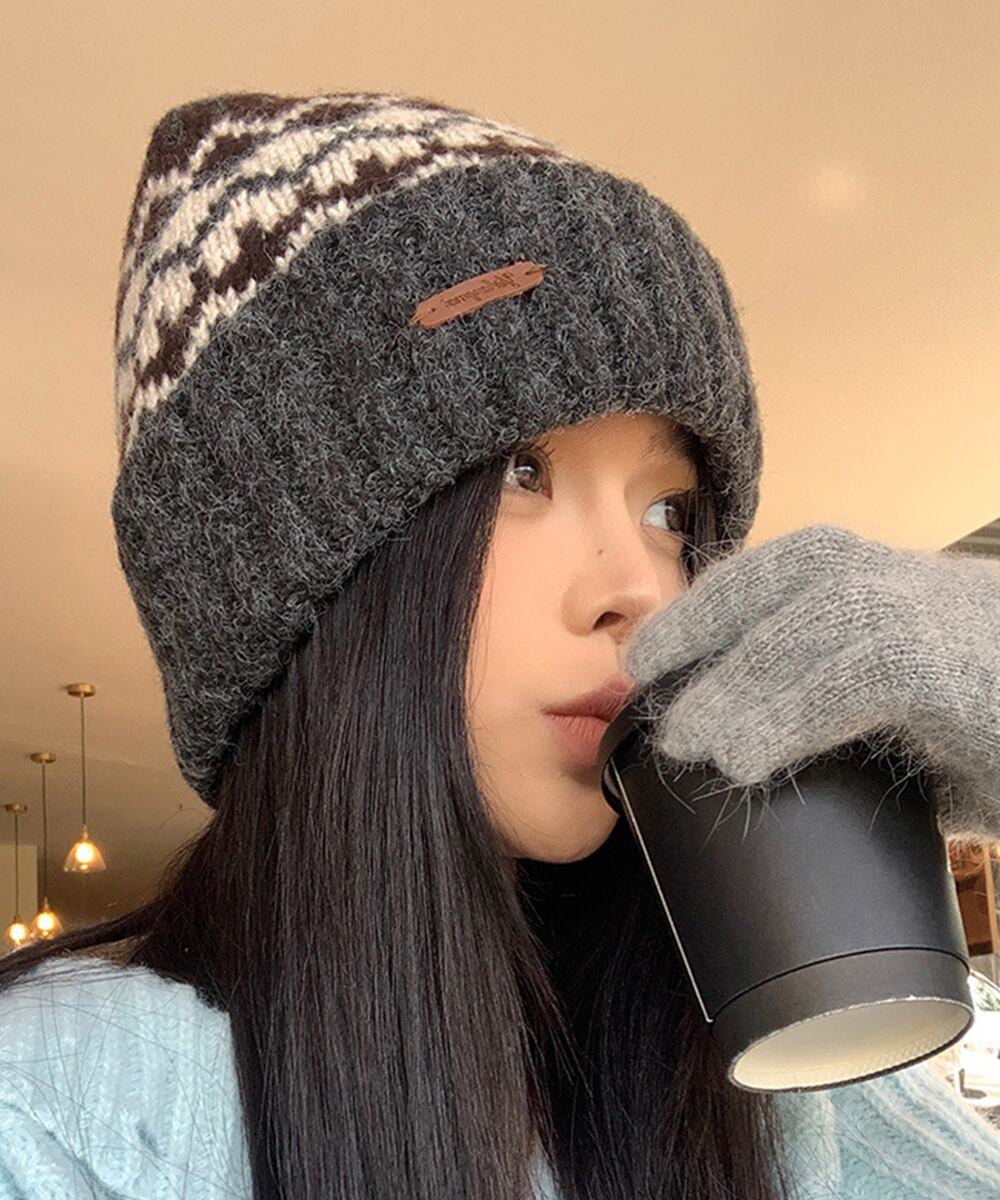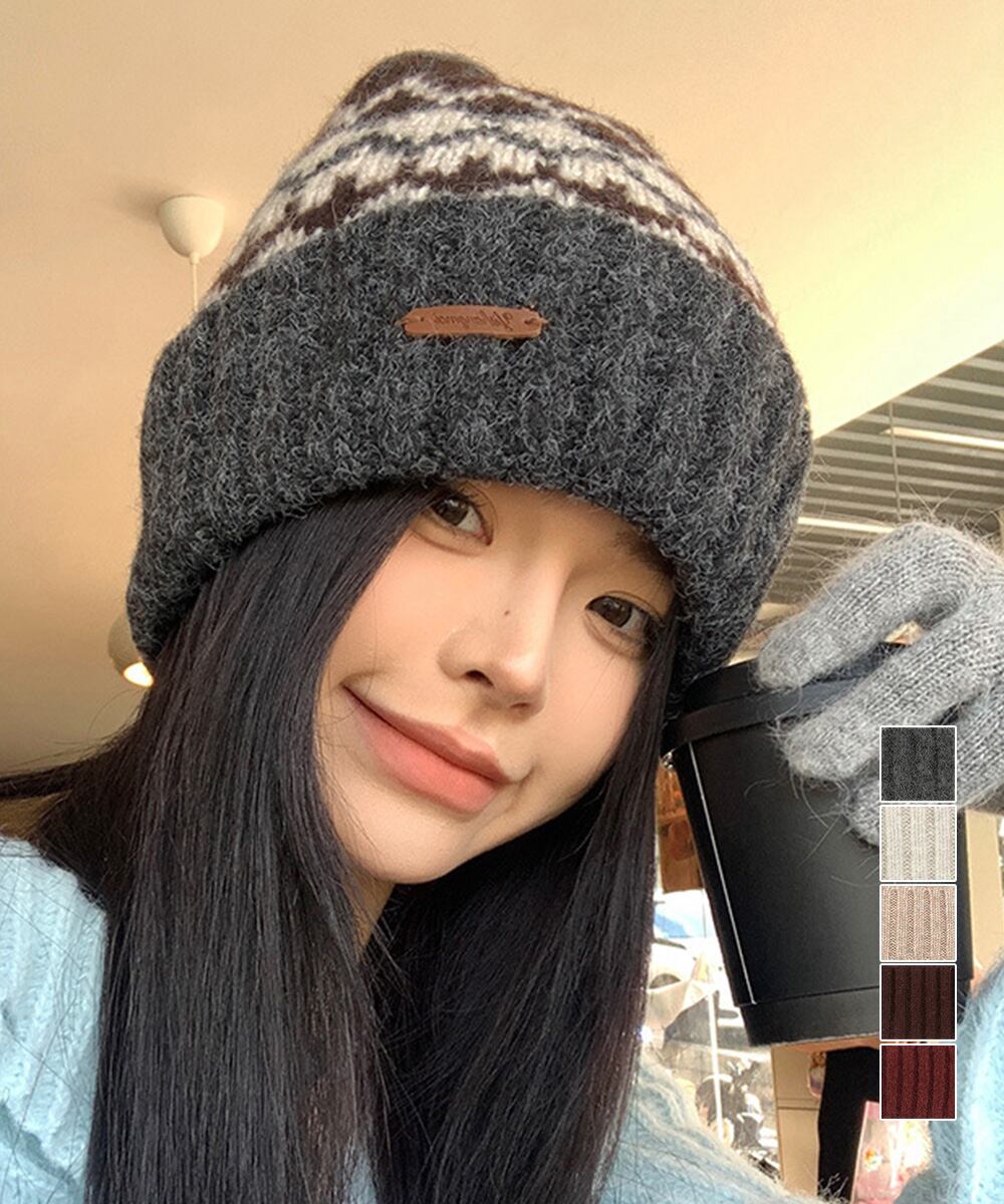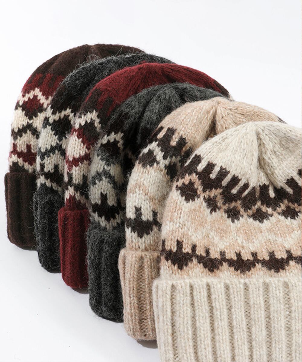 北欧風のフェアアイル柄が印象的な折り返しデザインのニット帽。