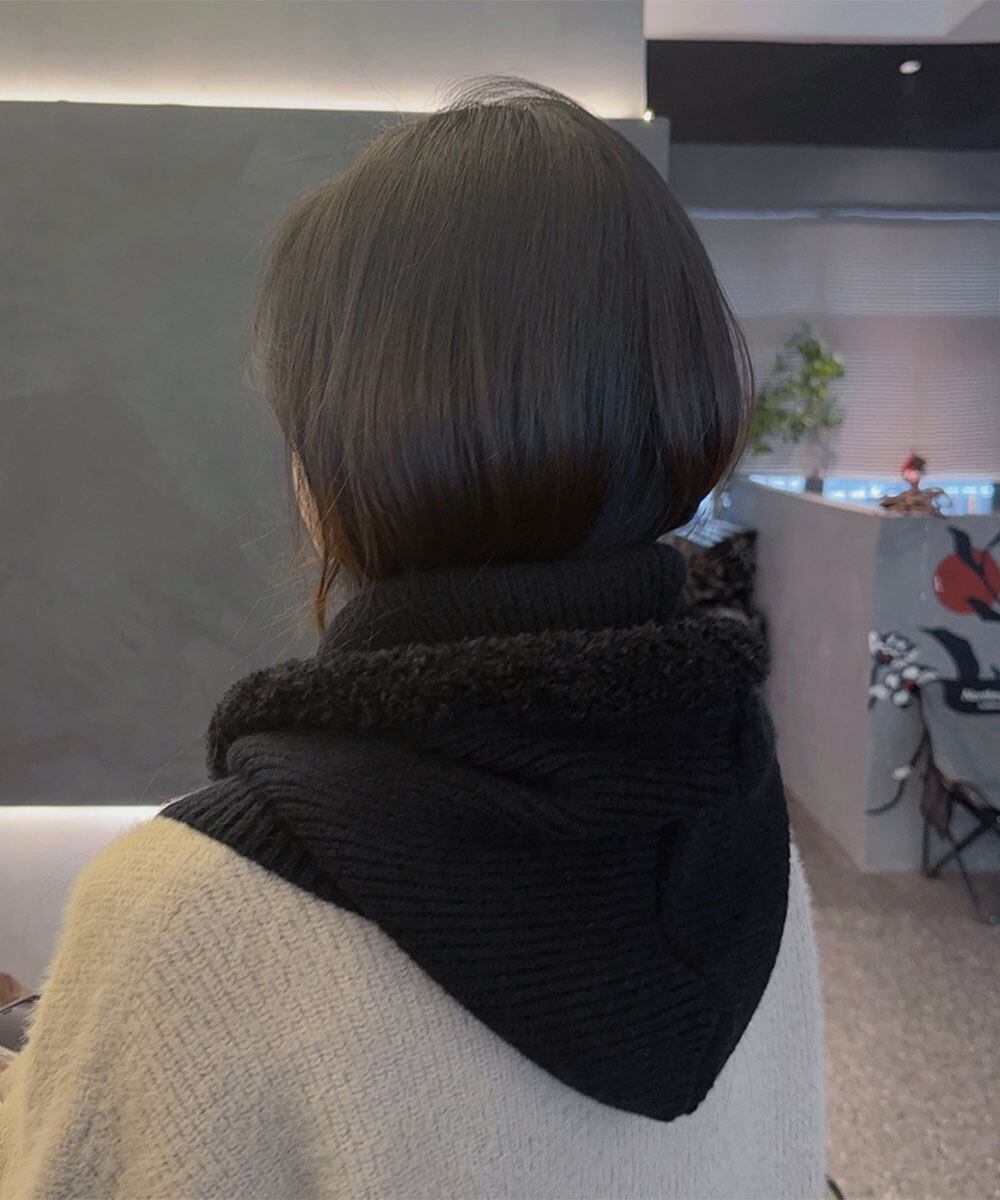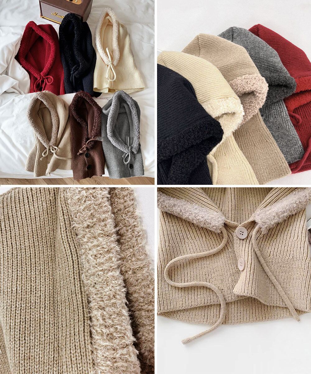 もこもこのボア素材とニットの組み合わせで、顔周りから首元まで暖かく包み込む。