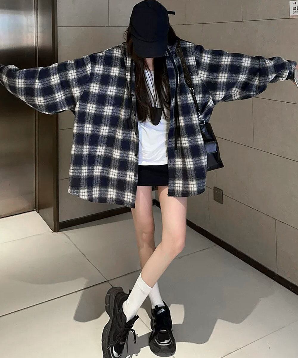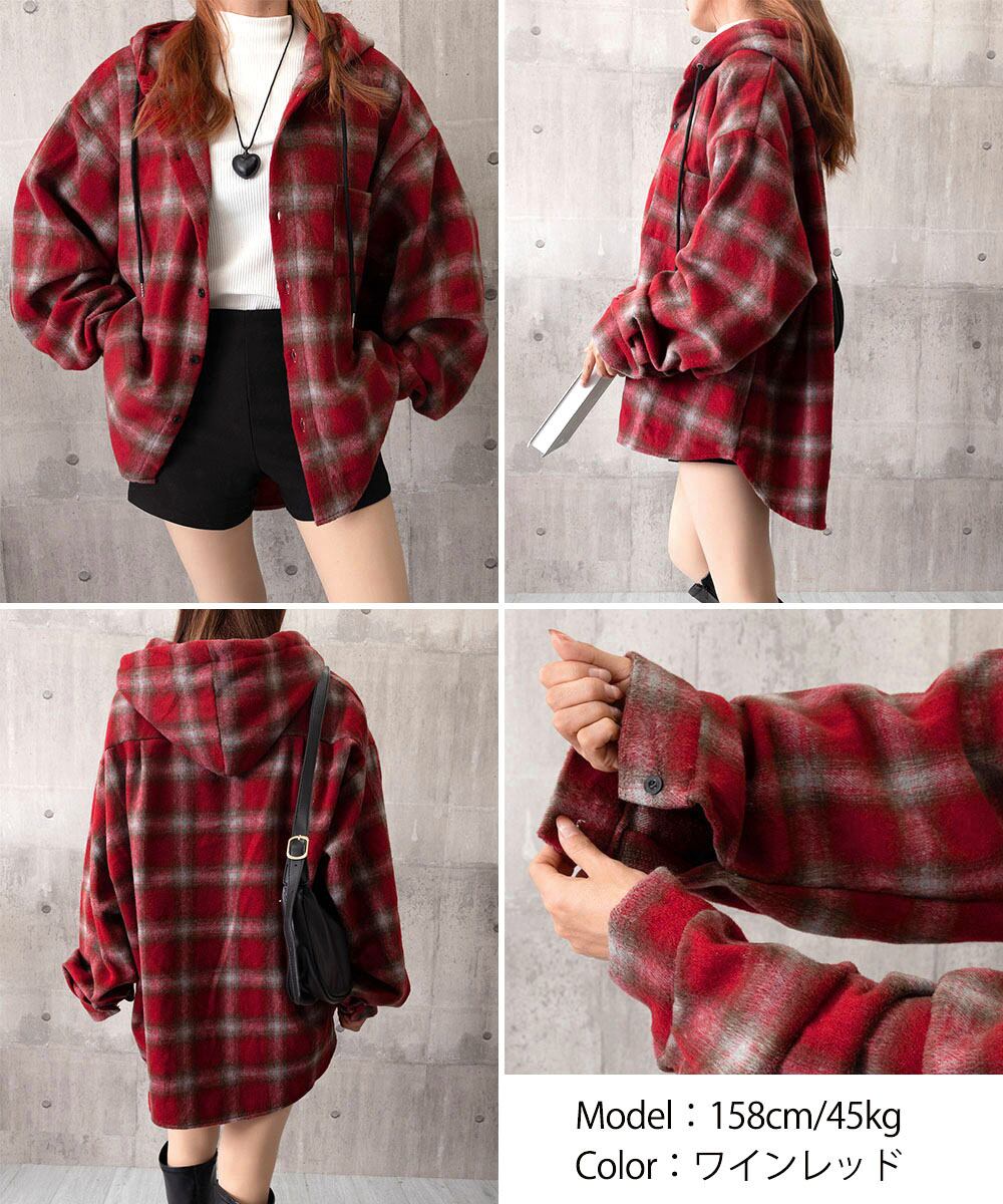 微起毛BIGフードシャツ オーバーサイズシャツジャケット ミディアム丈レトロチェックシャツ ゆったりこなれ感秋服アウター