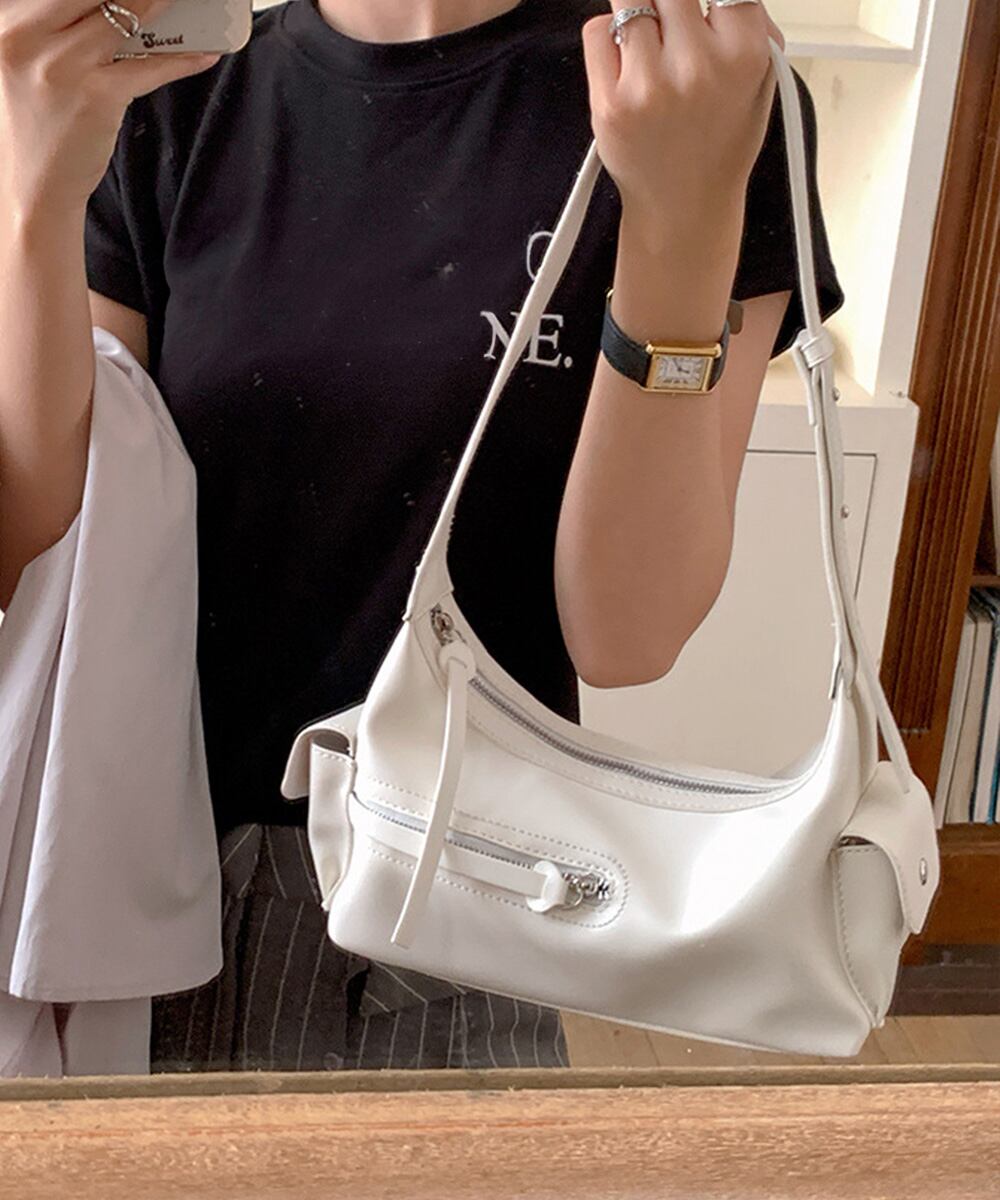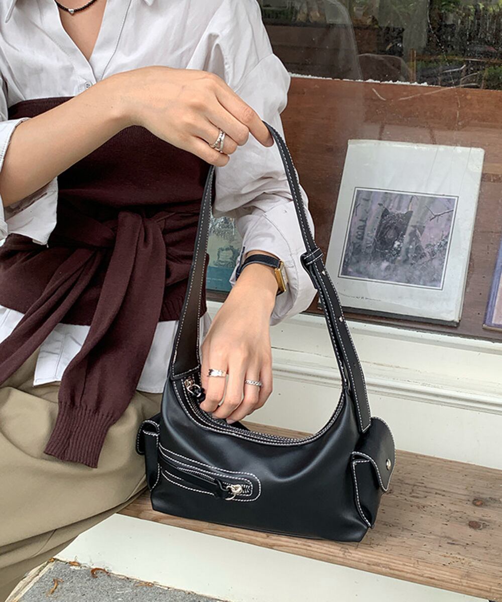 滑らかなフェイクレザーと程よい光沢感が、大人っぽさと上品さを引き立てるショルダーバッグ。