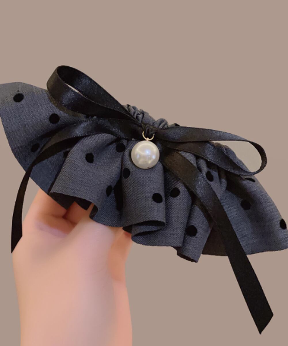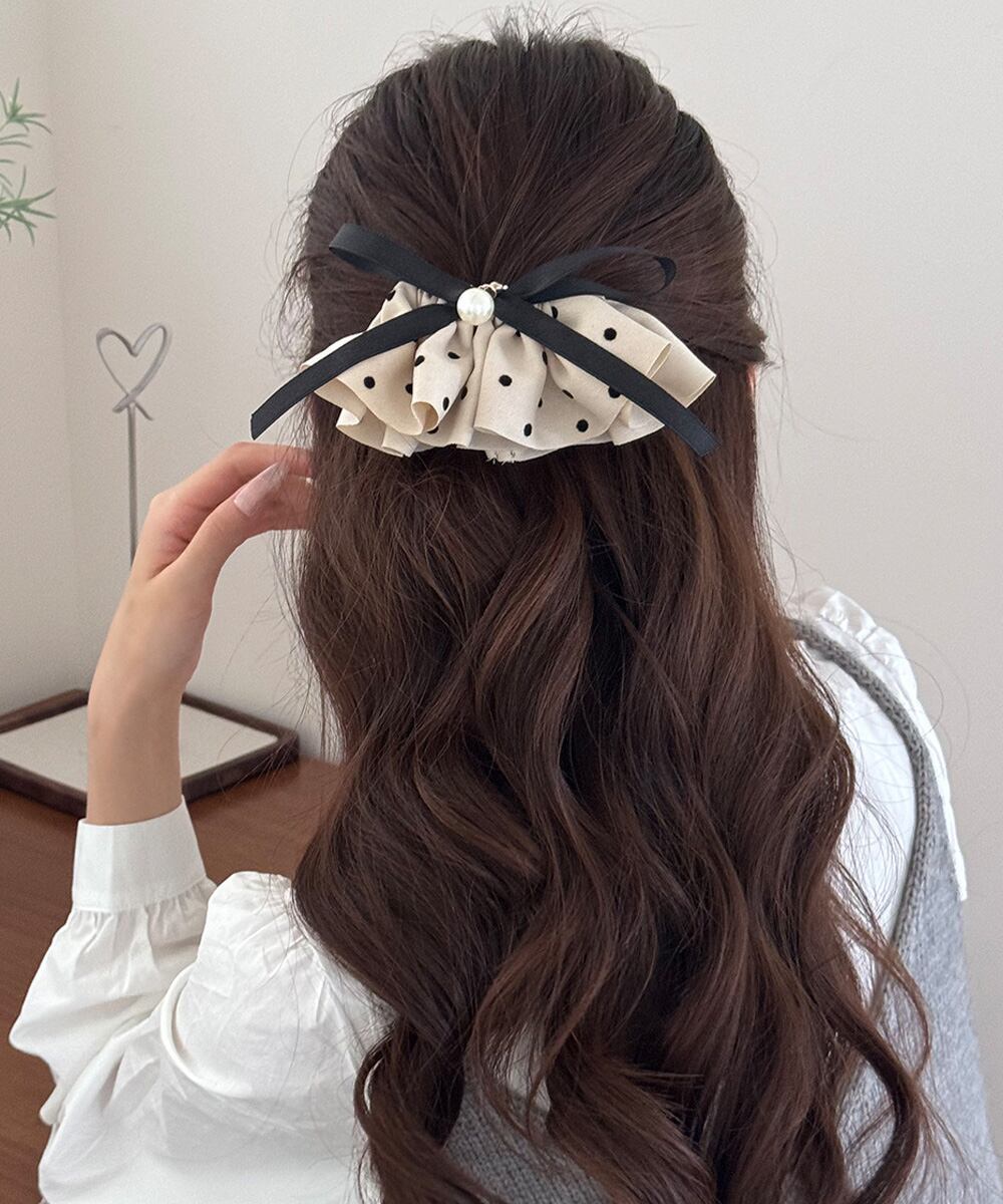 上品なドット柄フリルと、つややかなフェイクパールがアクセントになったヘアクリップ。