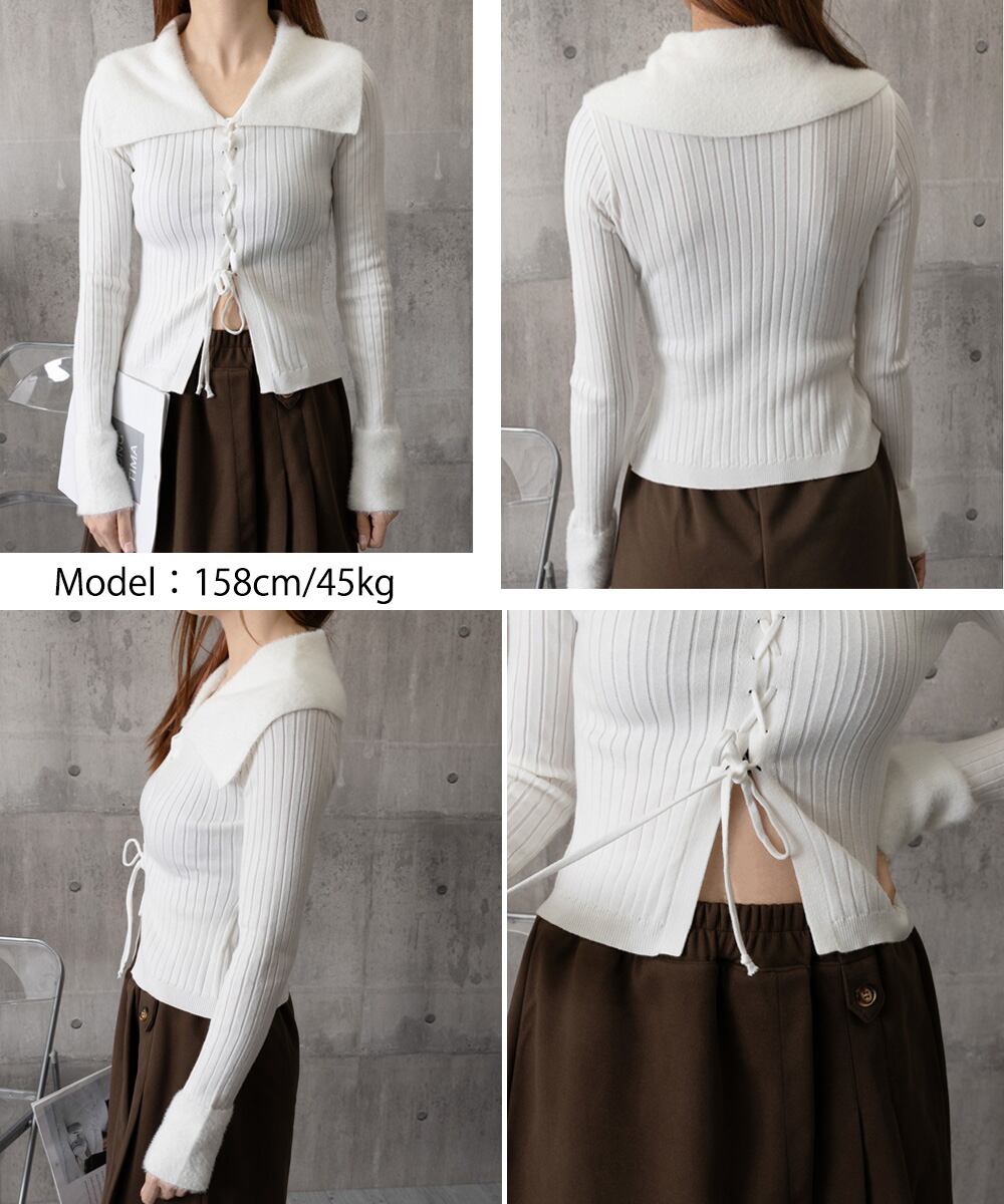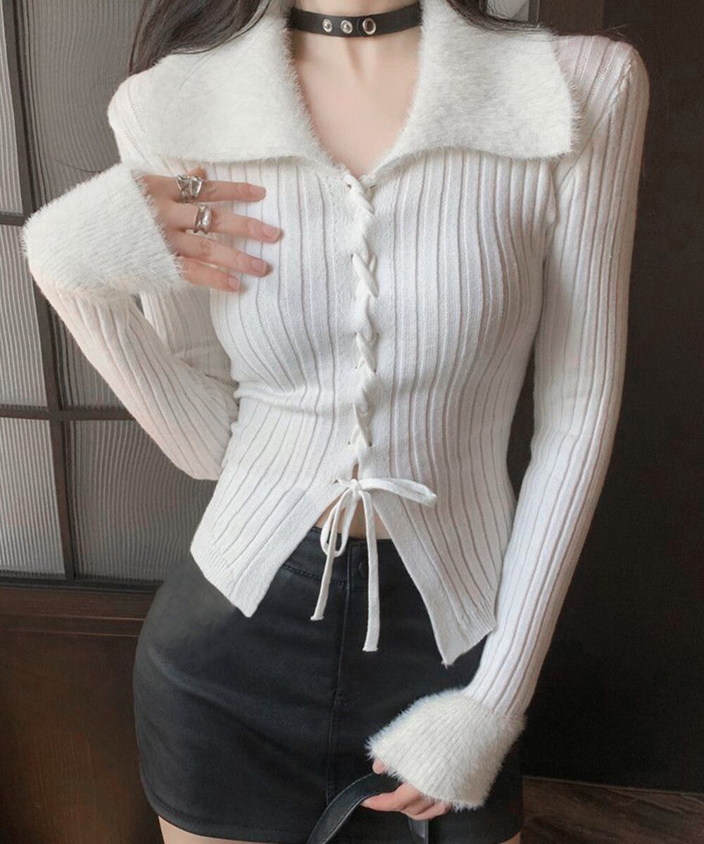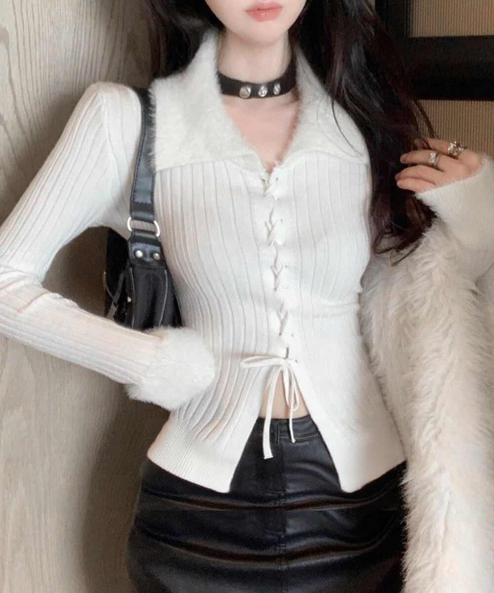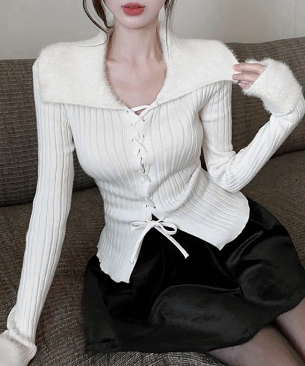 フェイクファーの襟と袖口が目を引く、季節感たっぷりのレースアップリブニットトップス。