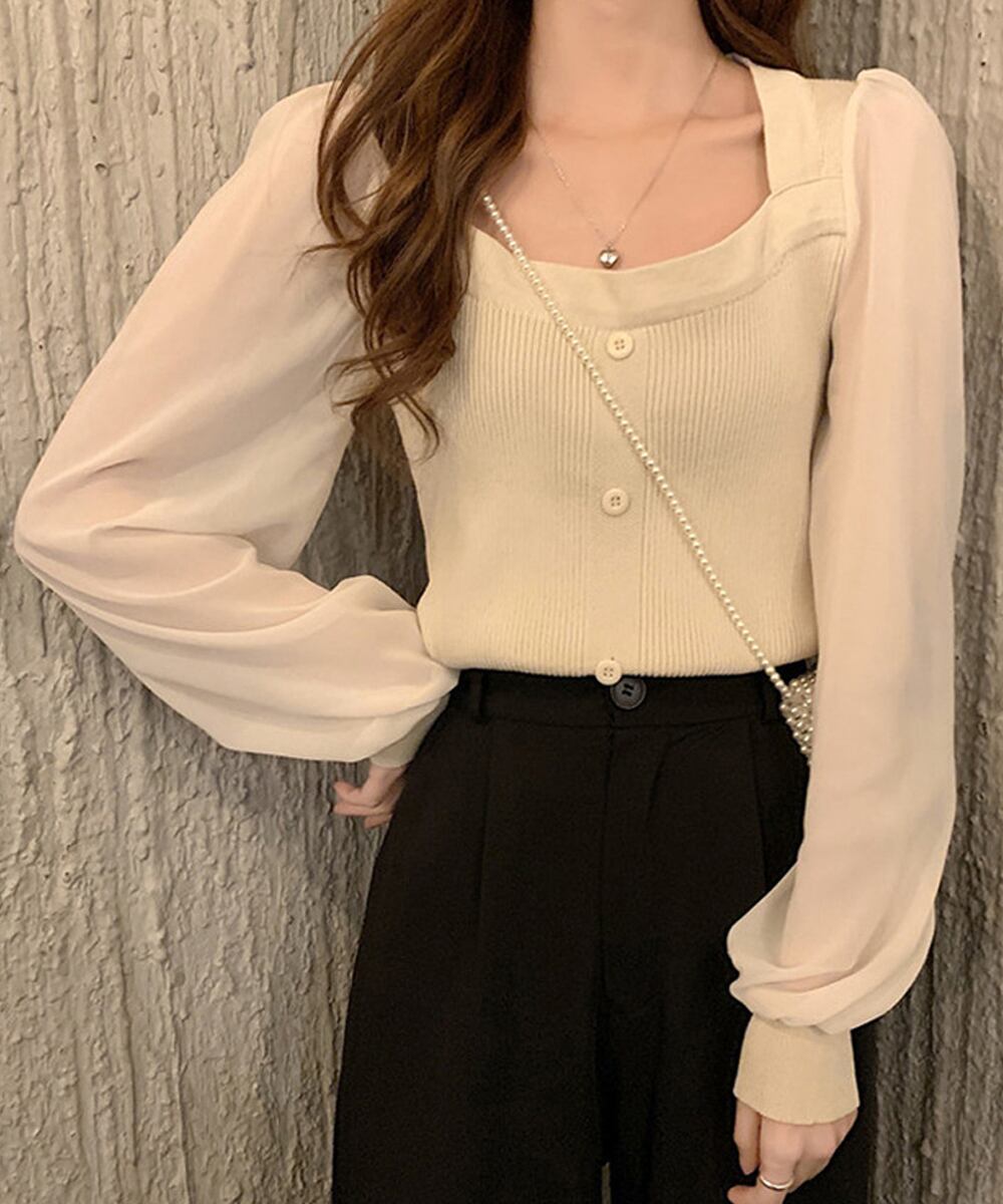 韓国風 ブラウス 長袖 ニットトップ 大人可愛い シャツ